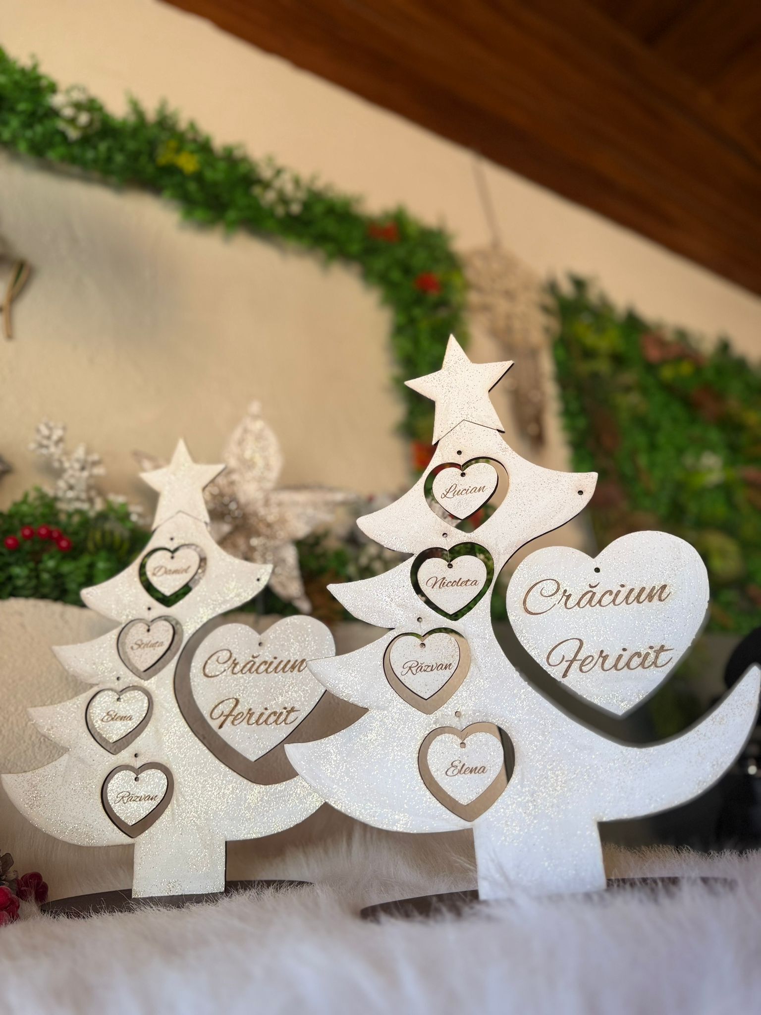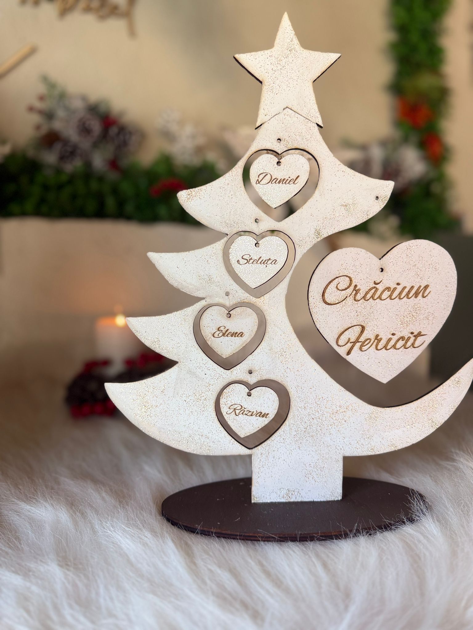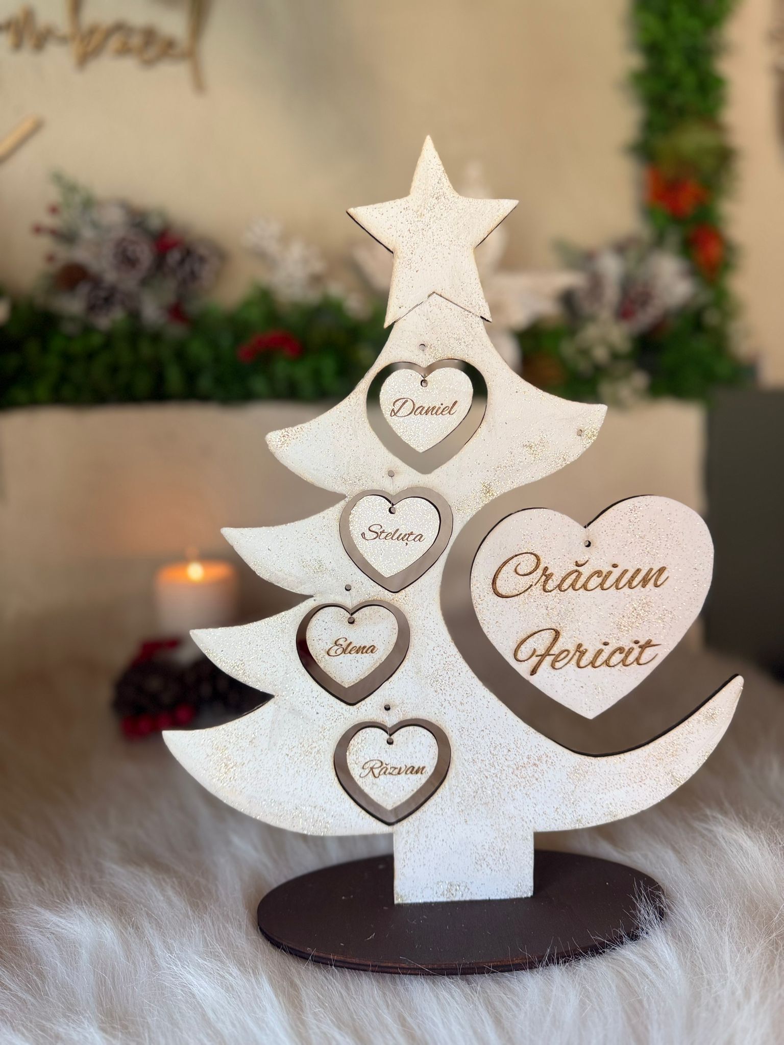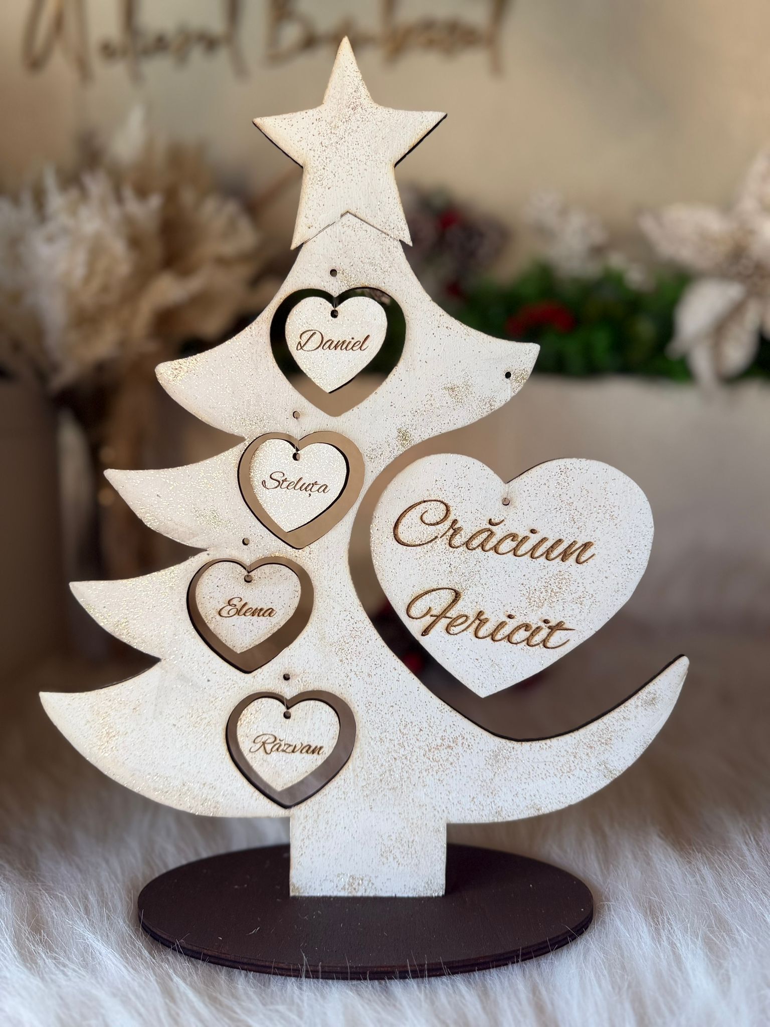 "Bradutul Familiei" este alegerea perfectă pentru a aduce spiritul sărbătorilor în casa ta, creând momente magice alături de cei dragi. Realizat din materiale de înaltă calitate, acest brad impresionează prin designul său elegant. Crează amintiri de neuitat cu "Bradutul Familiei".Il puteti personaliza cu maxim 6 nume. Dimensiuni produs : 37 cm înăltime x 28 lățime .