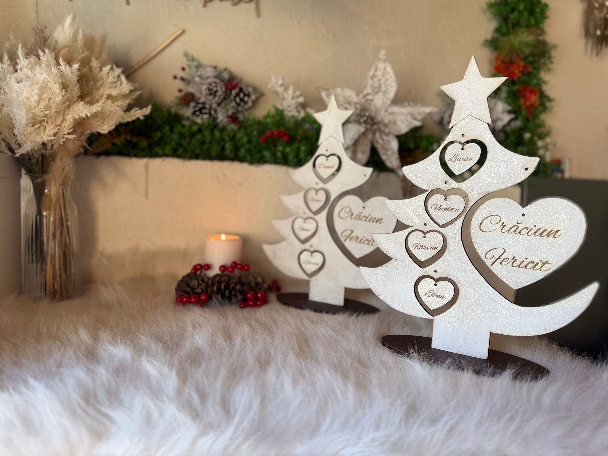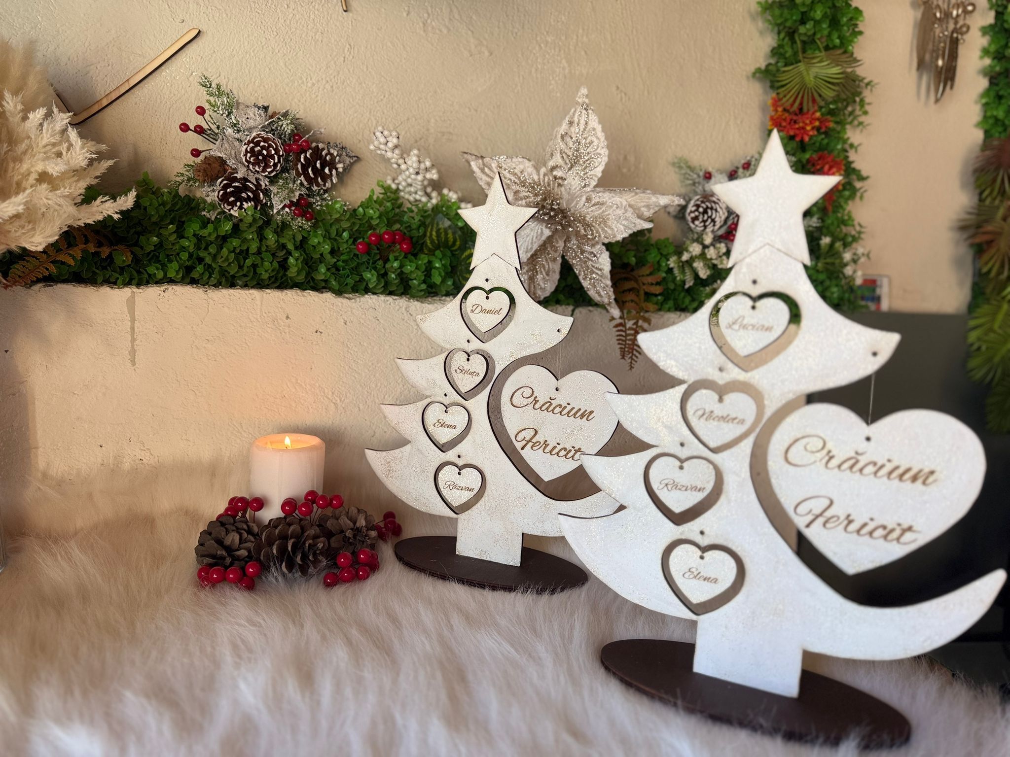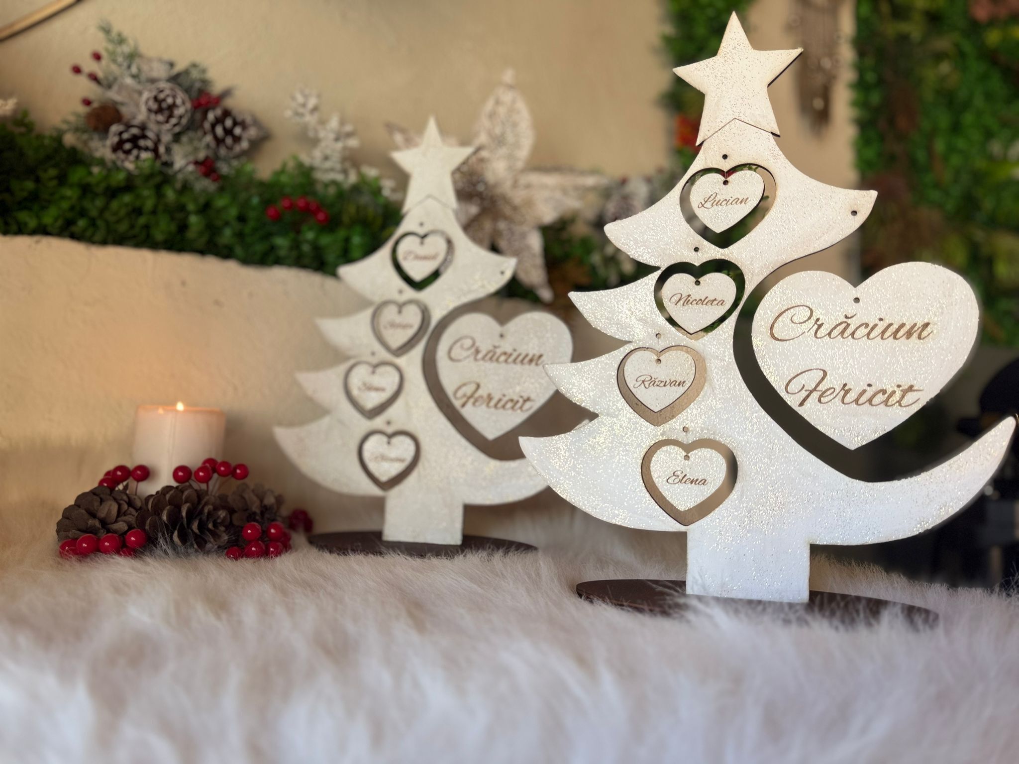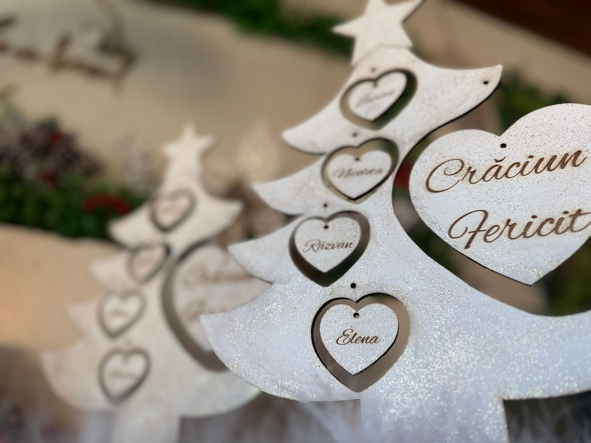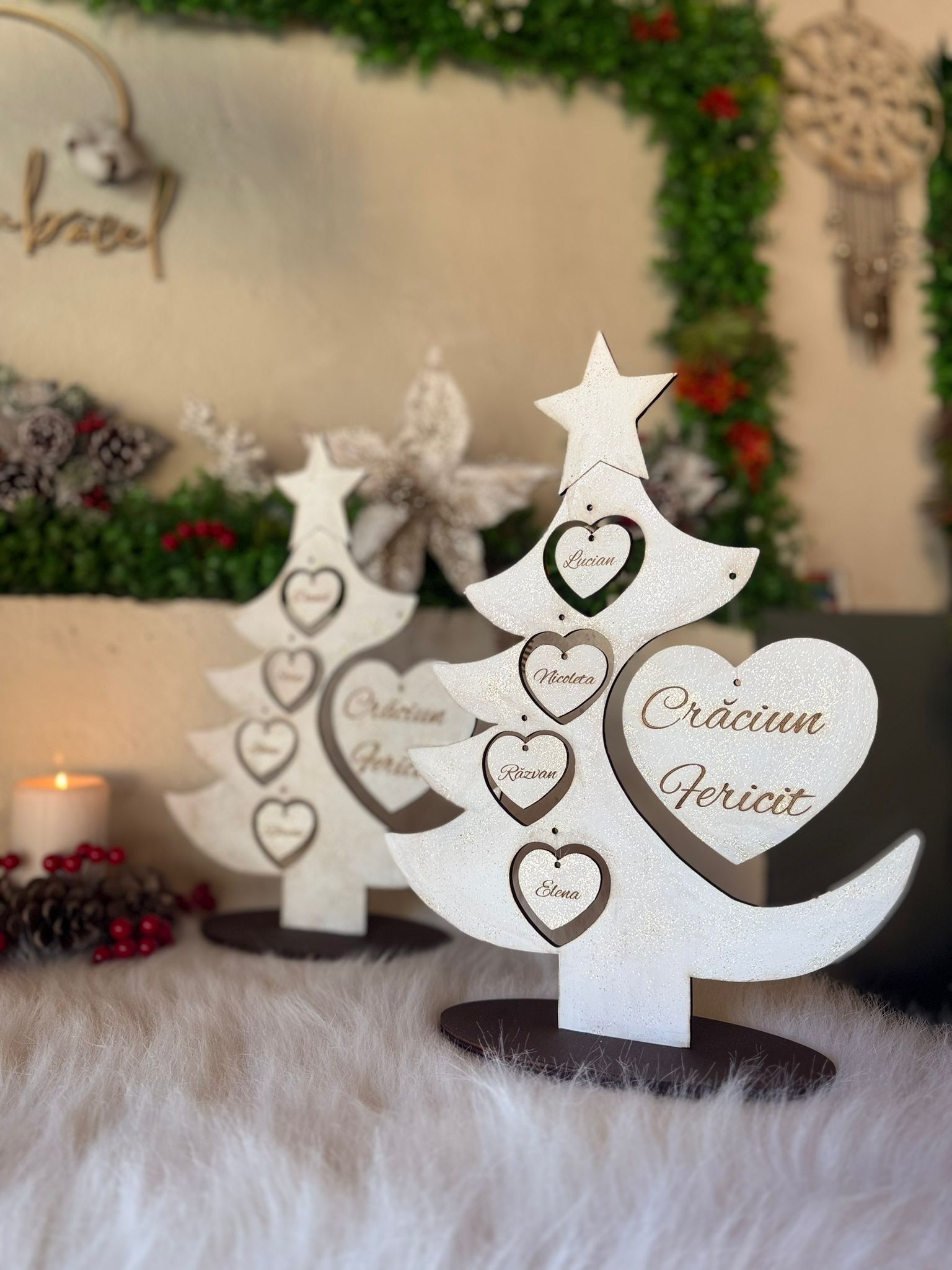 "Bradutul Familiei" este alegerea perfectă pentru a aduce spiritul sărbătorilor în casa ta, creând momente magice alături de cei dragi. Realizat din materiale de înaltă calitate, acest brad impresionează prin designul său elegant. Crează amintiri de neuitat cu "Bradutul Familiei".Il puteti personaliza cu maxim 6 nume. Dimensiuni produs : 37 cm înăltime x 28 lățime .