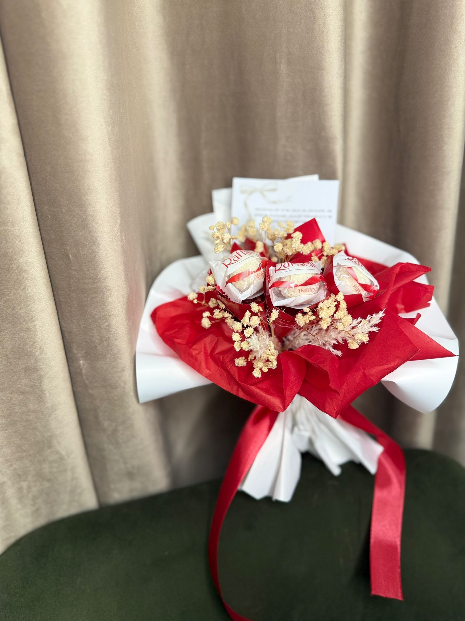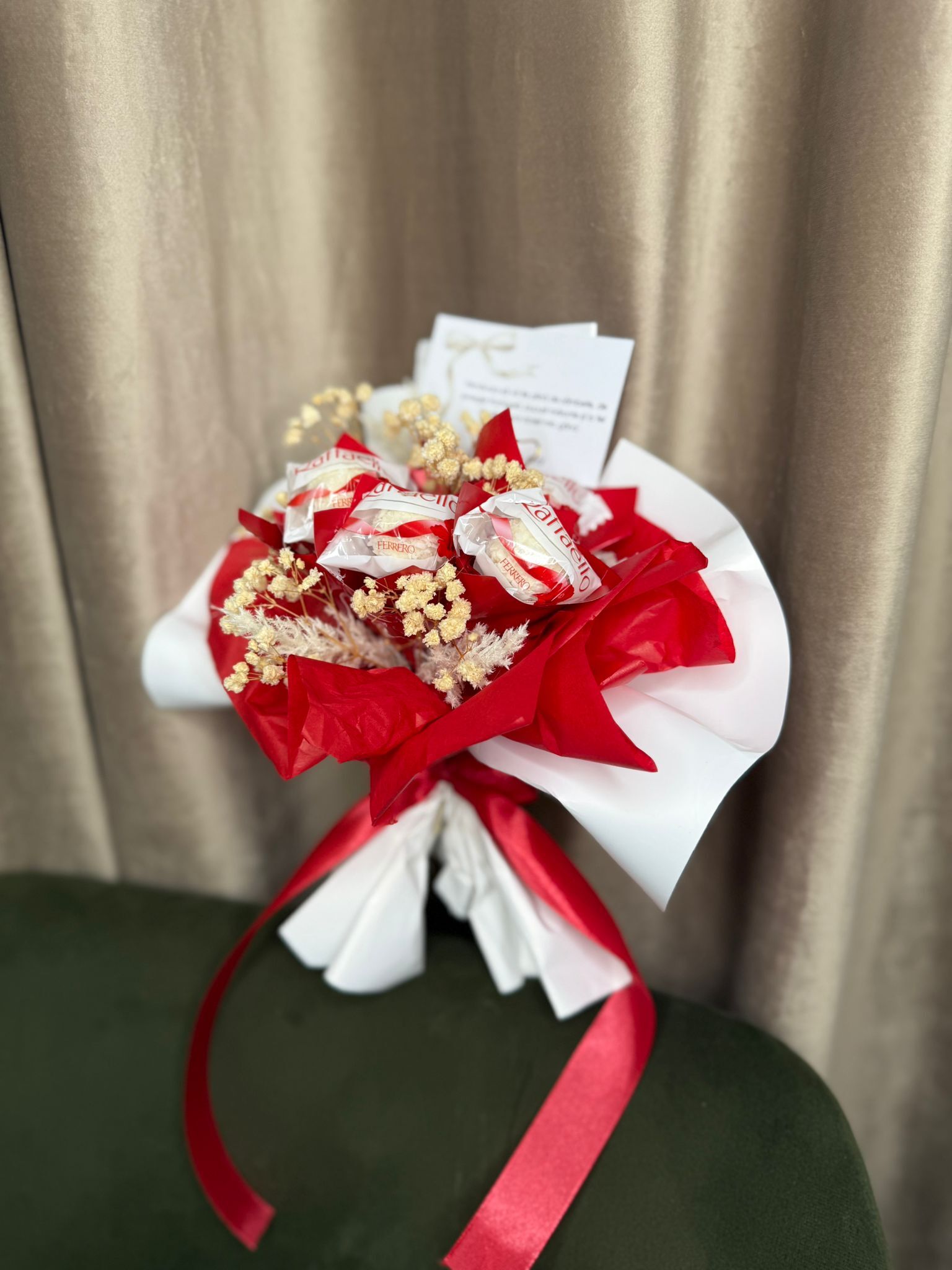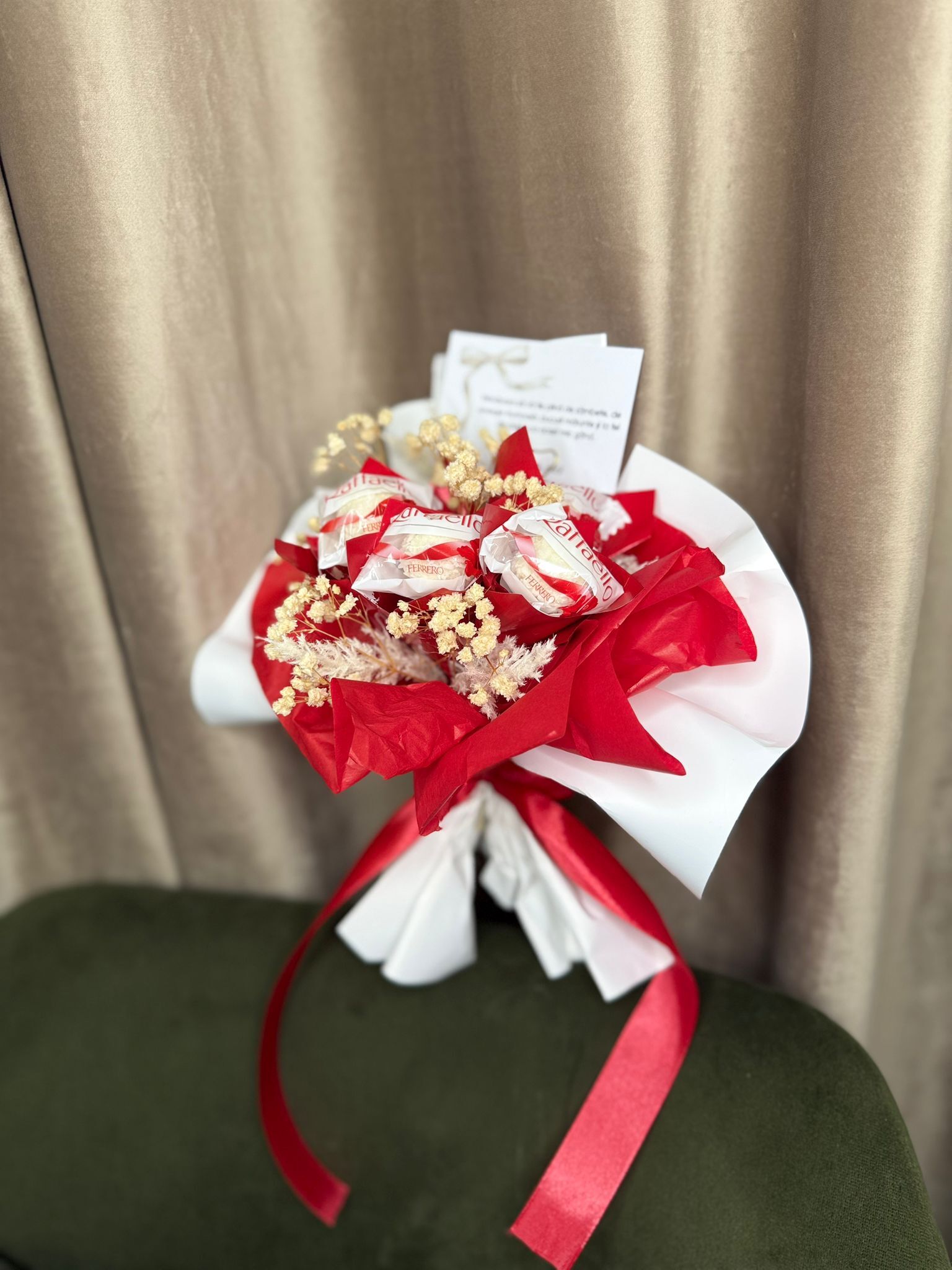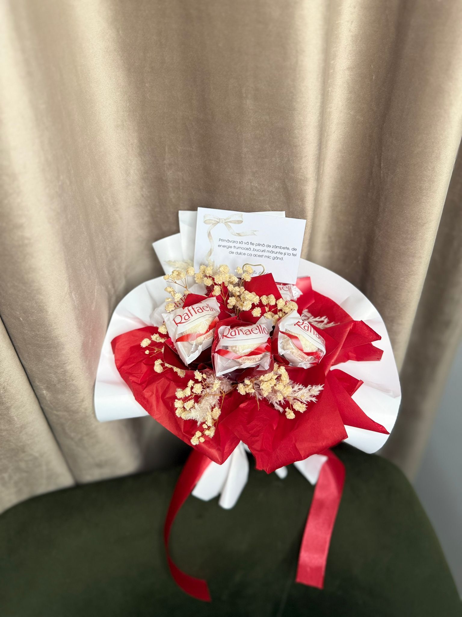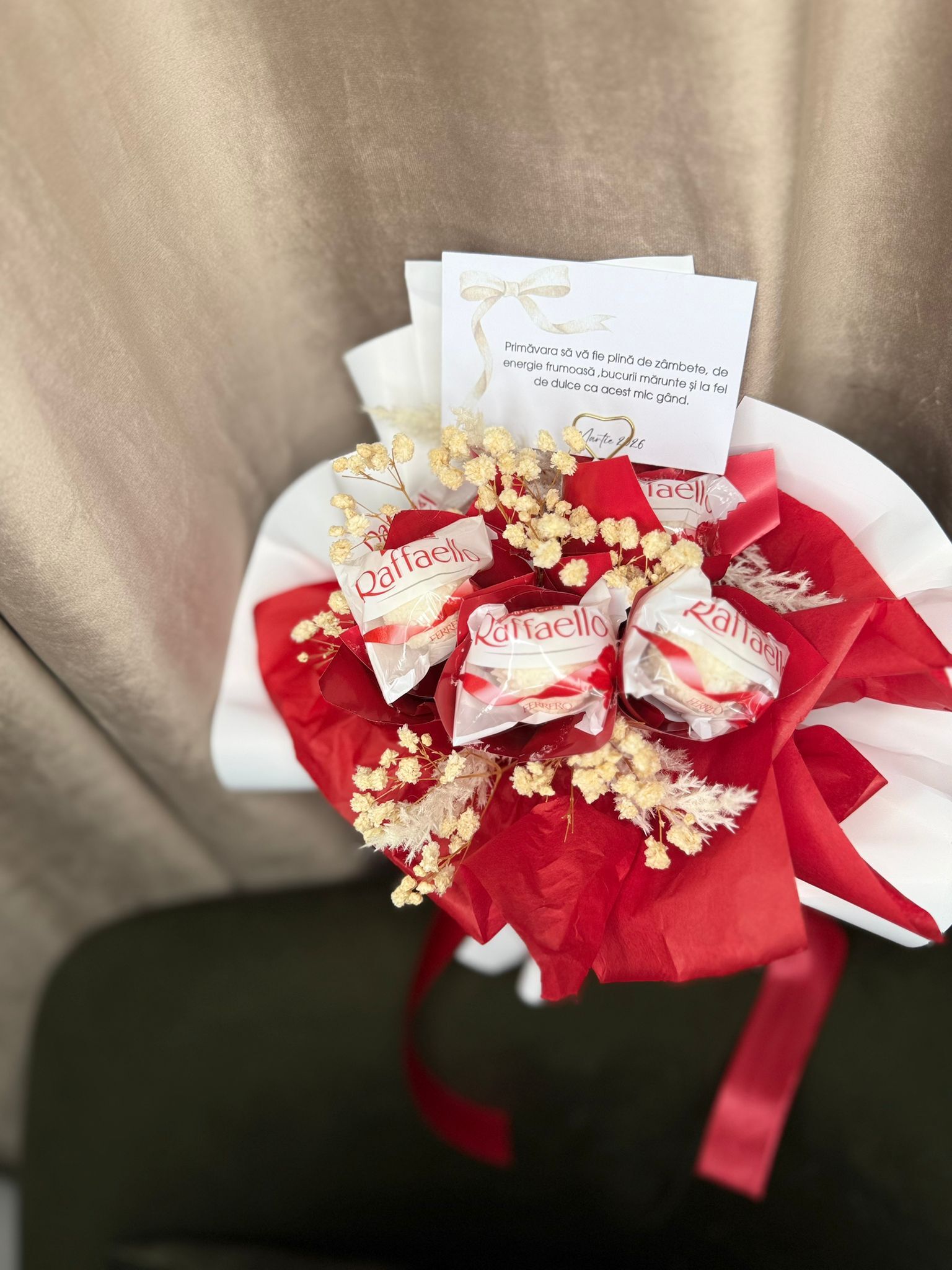 Buchetel dulce Raffaello este un cadou elegant și delicios, perfect pentru momentele speciale. Acest buchet inedit combină delicatețea bomboanelor Raffaello, cu aromă fină de nucă de cocos și migdală, într-o prezentare rafinată și atrăgătoare. Ideal pentru a surprinde persoanele dragi, acesta îmbină rafinamentul gustului cu un aspect spectaculos, transformând orice ocazie într-un moment de neuitat. Oferă un gest plin de savoare și eleganță!