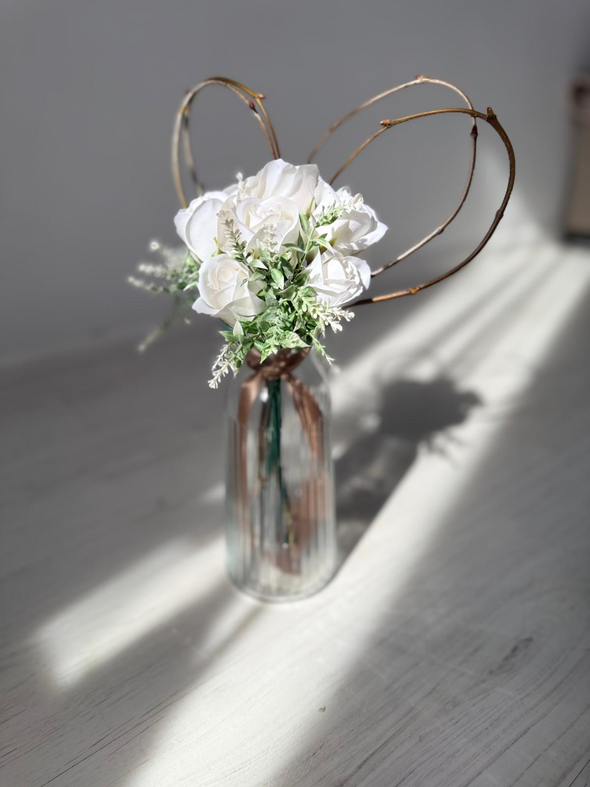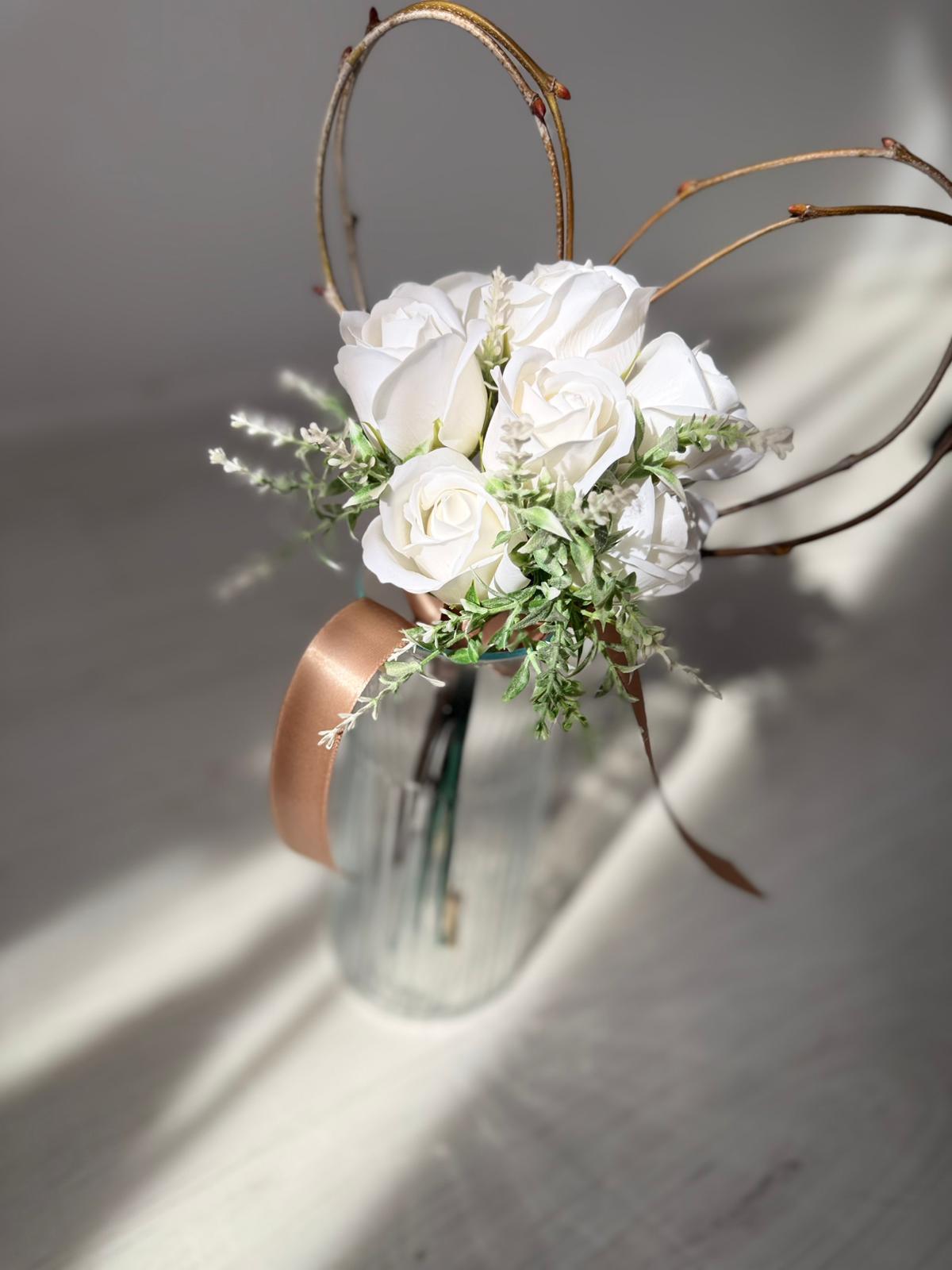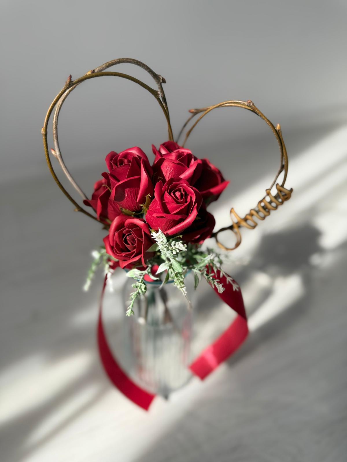 Buchetelul "Inimioară și trandafiri din săpun personalizat cu nume" este un cadou unic și rafinat, special creat pentru a impresiona. Acest aranjament delicat combină frumusețea trandafirilor din săpun, care își păstrează aspectul impecabil în timp, cu o inimioară personalizată ce adaugă o notă personală memorabilă. Este perfect pentru a celebra momente speciale și pentru a oferi un simbol al afecțiunii care durează.Buchetul contine 7 trandafiri din sapun.