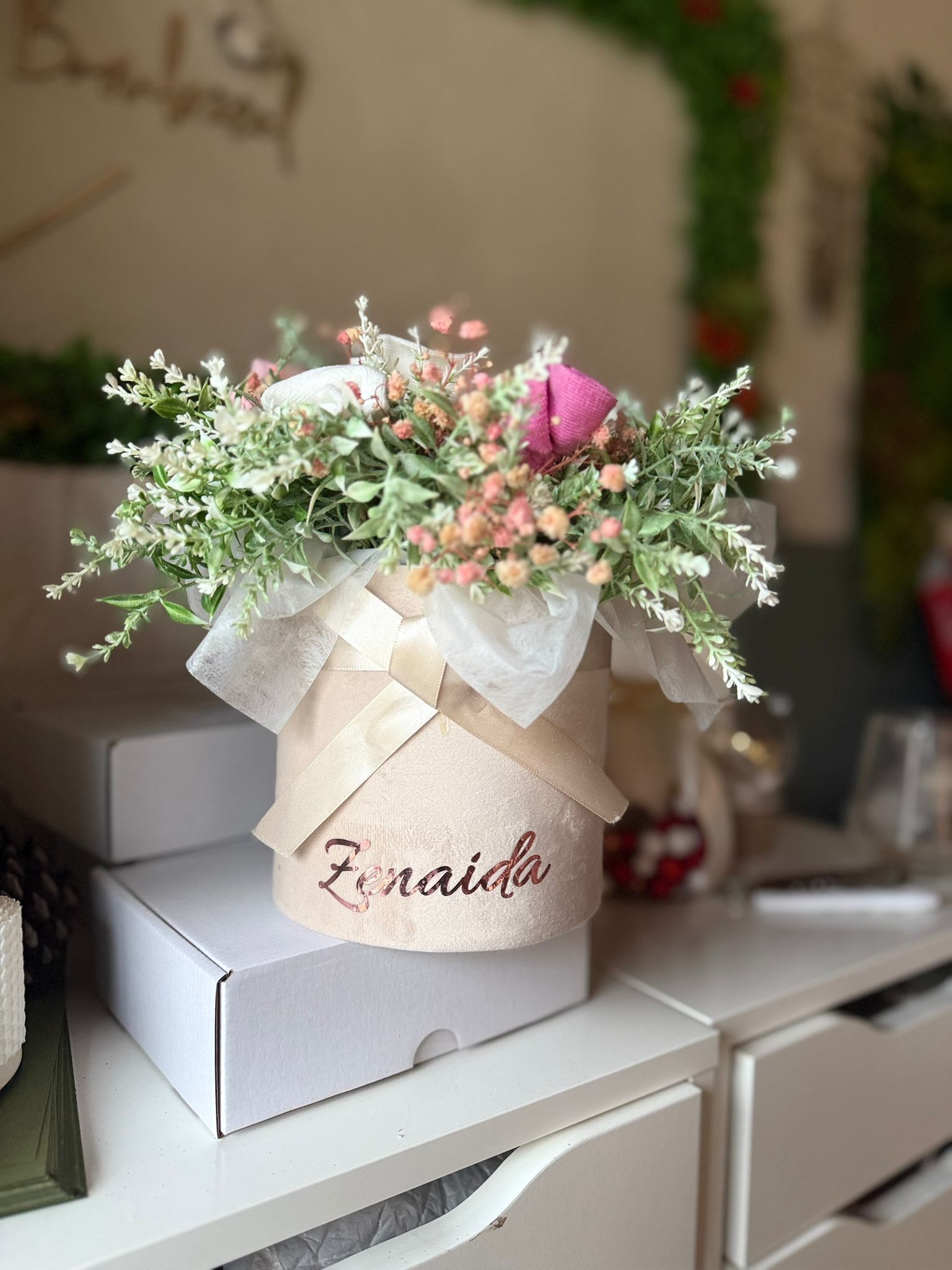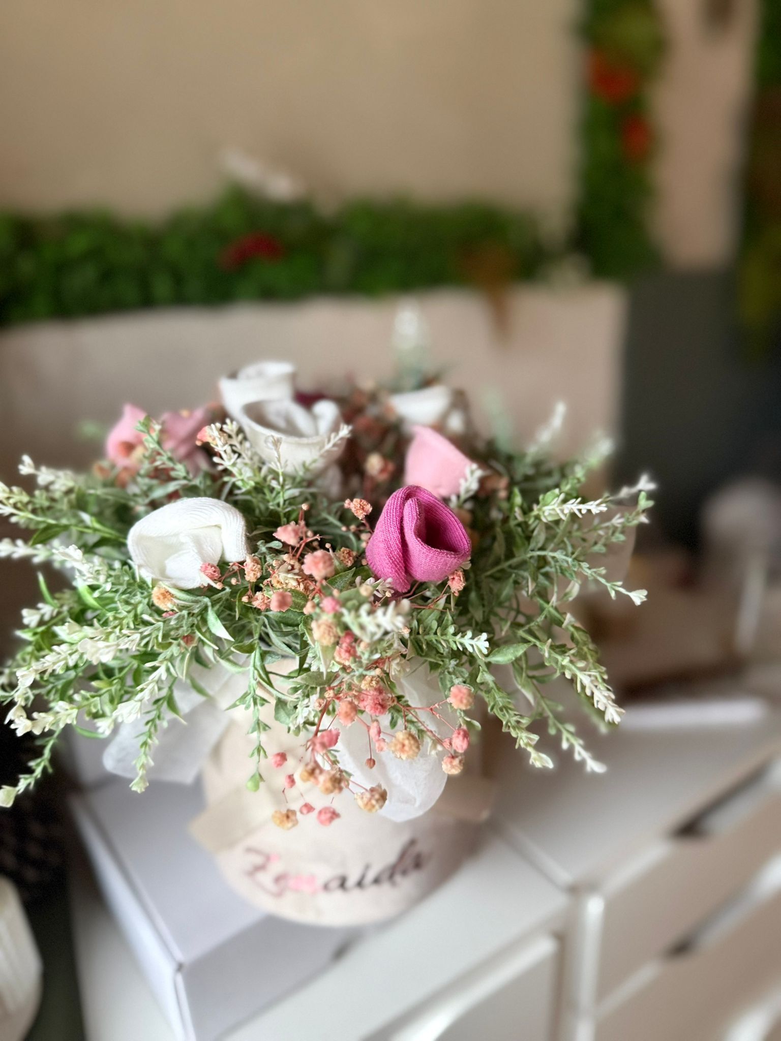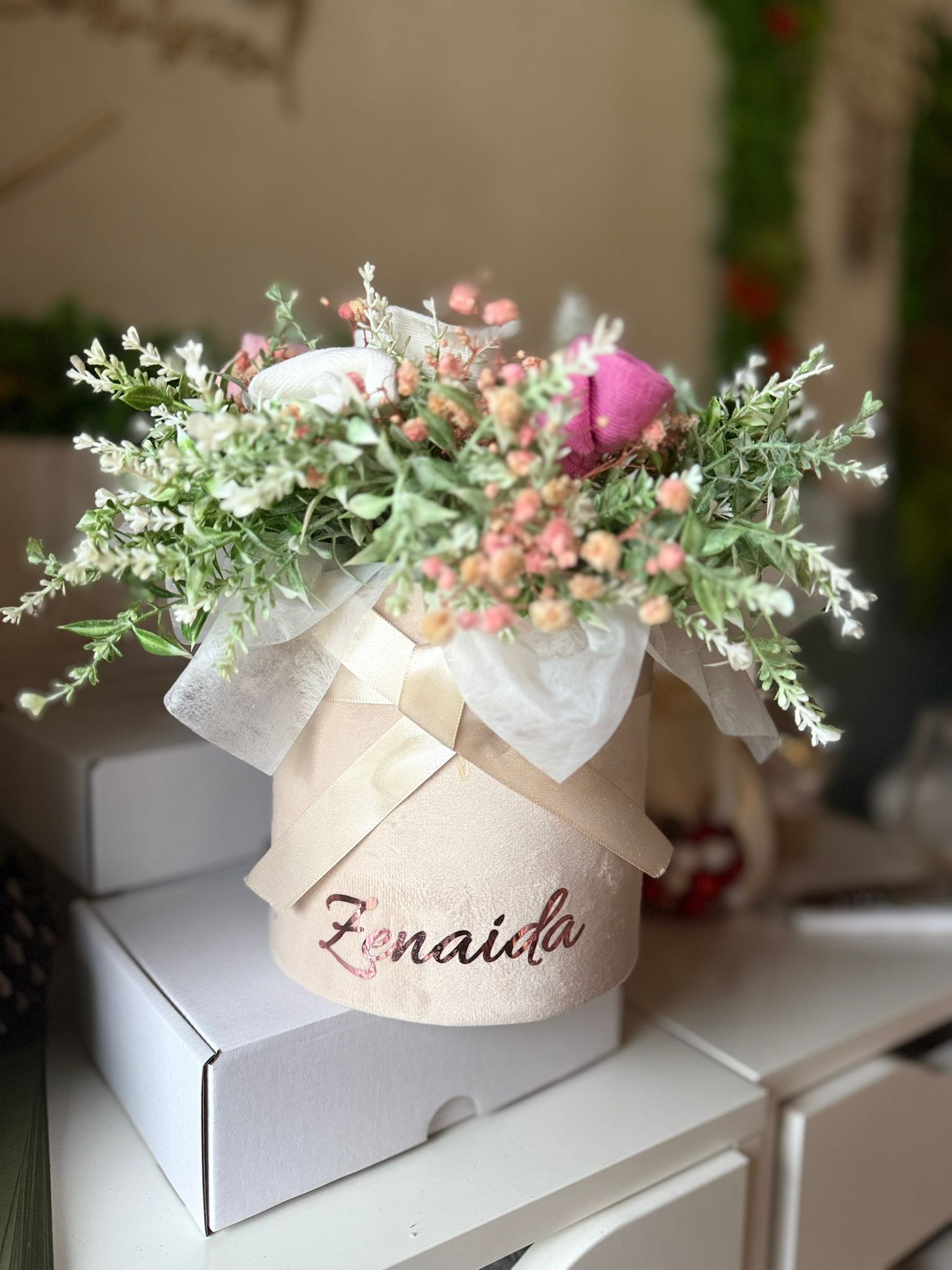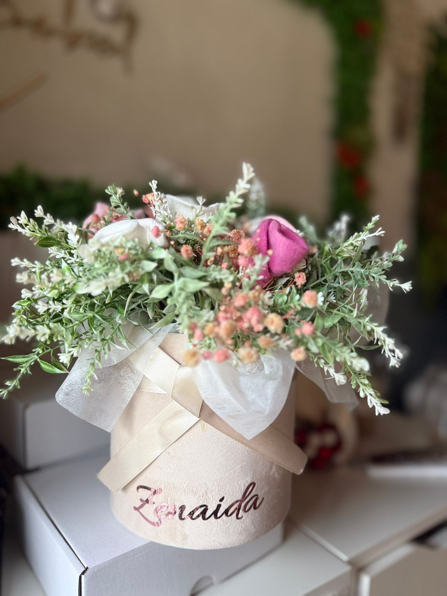 Cutie de catifea rotunda , aranjament din flori artificiale lavanda alb si sosetele pentru bebelusi ce pot fi de mai multe culori .