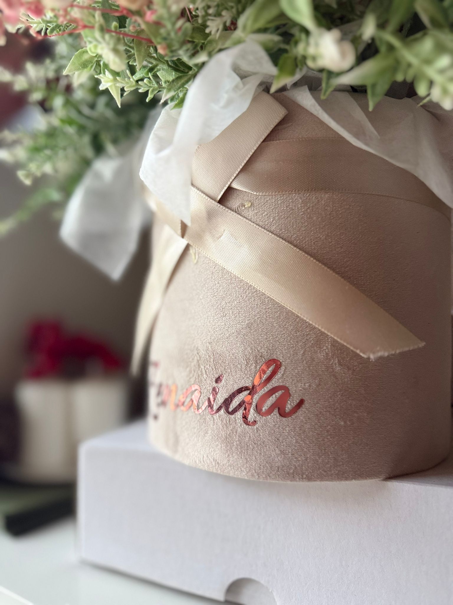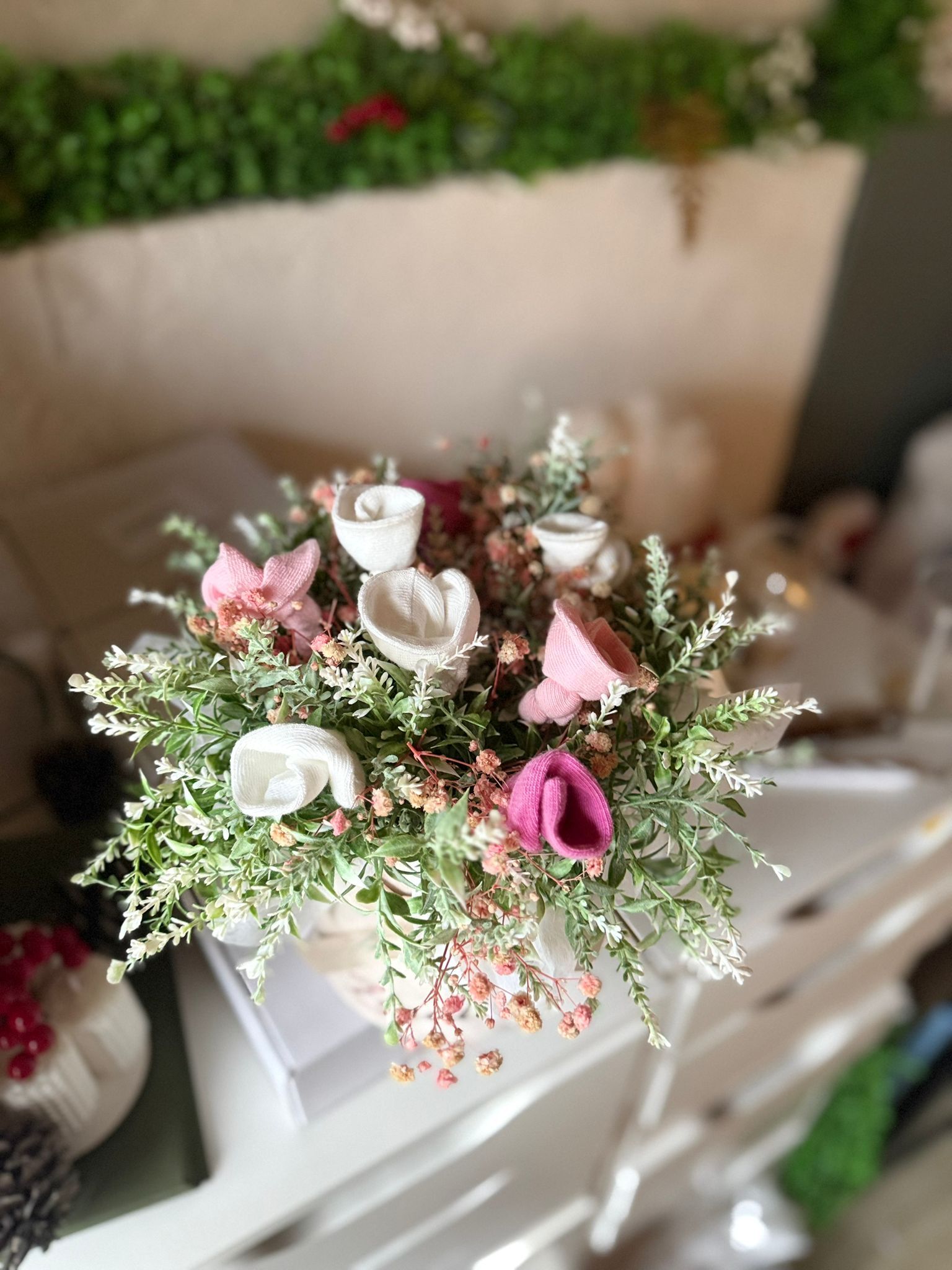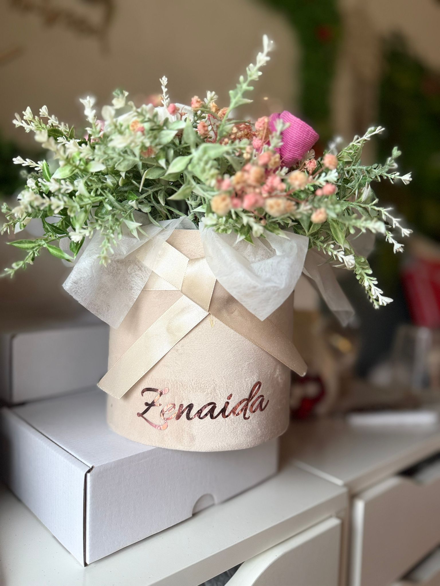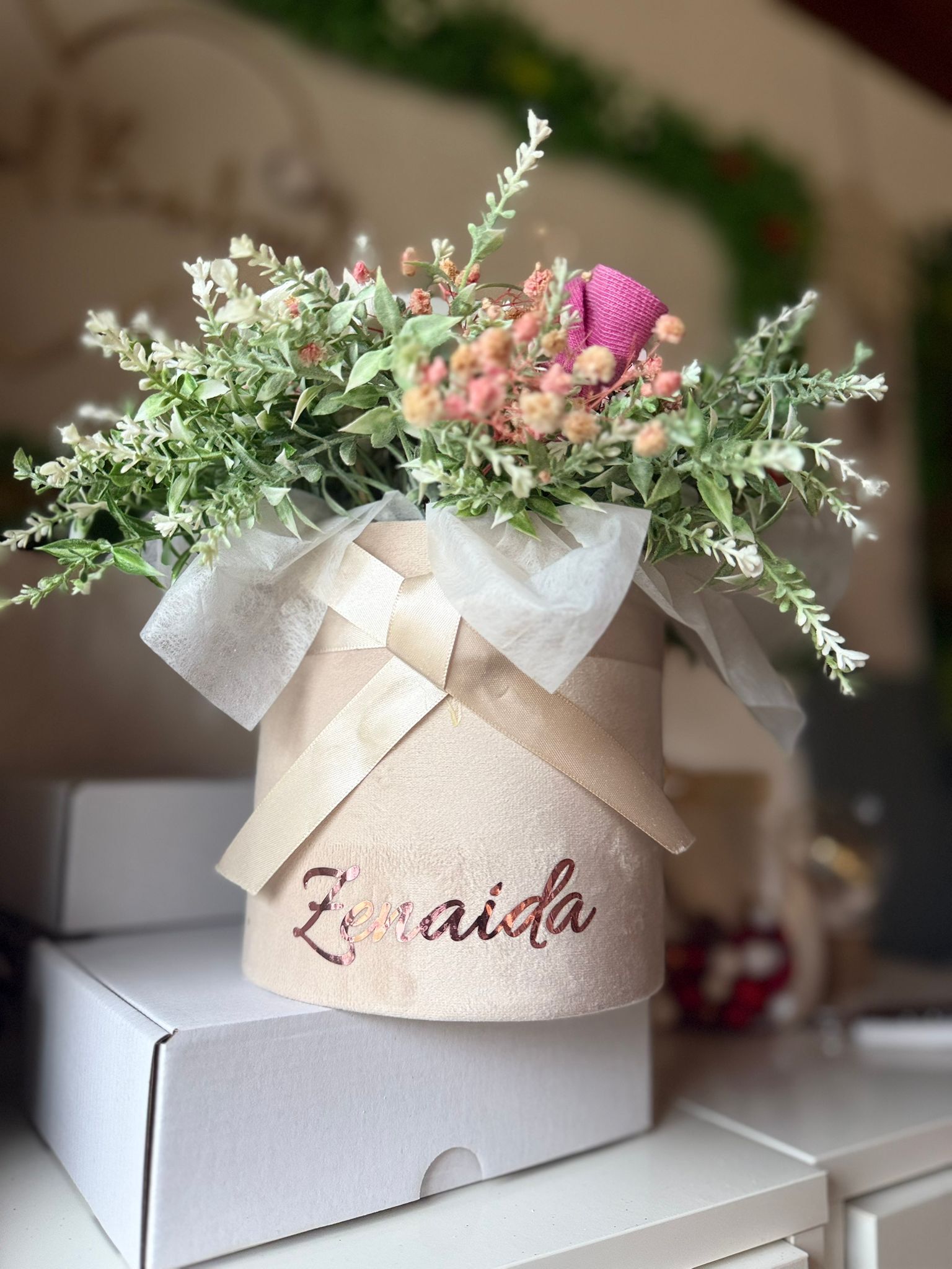 Cutie de catifea rotunda , aranjament din flori artificiale lavanda alb si sosetele pentru bebelusi ce pot fi de mai multe culori .