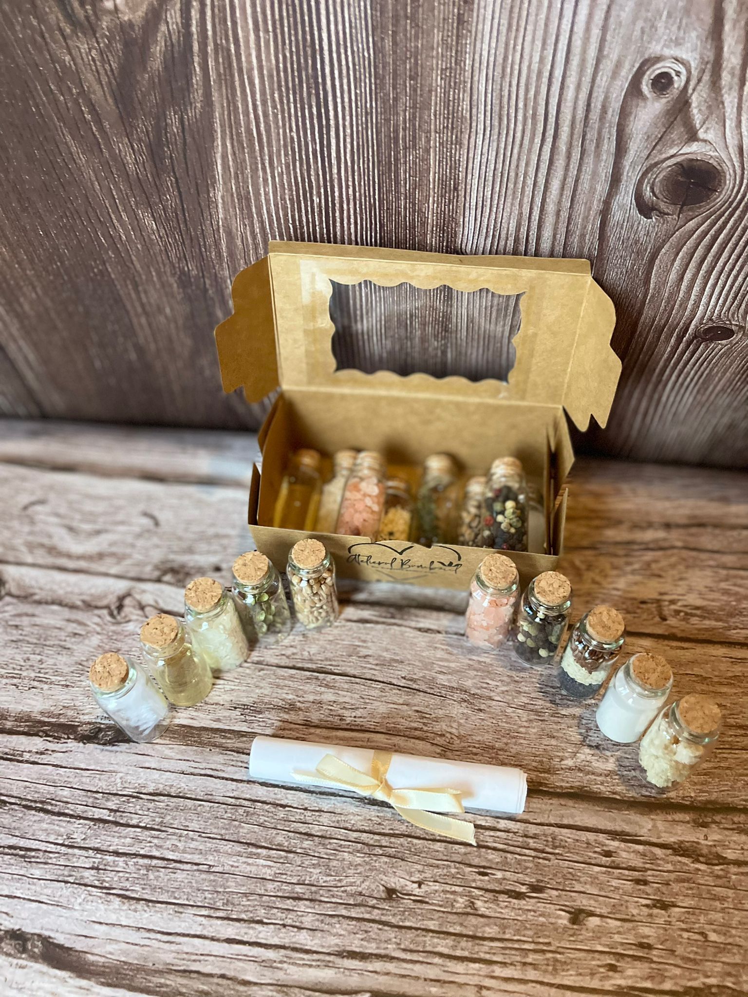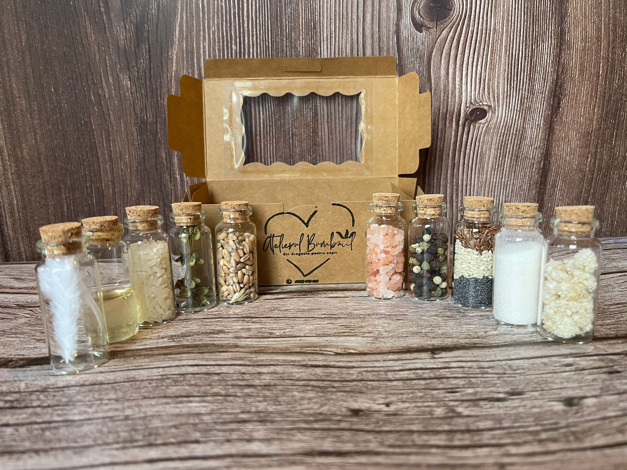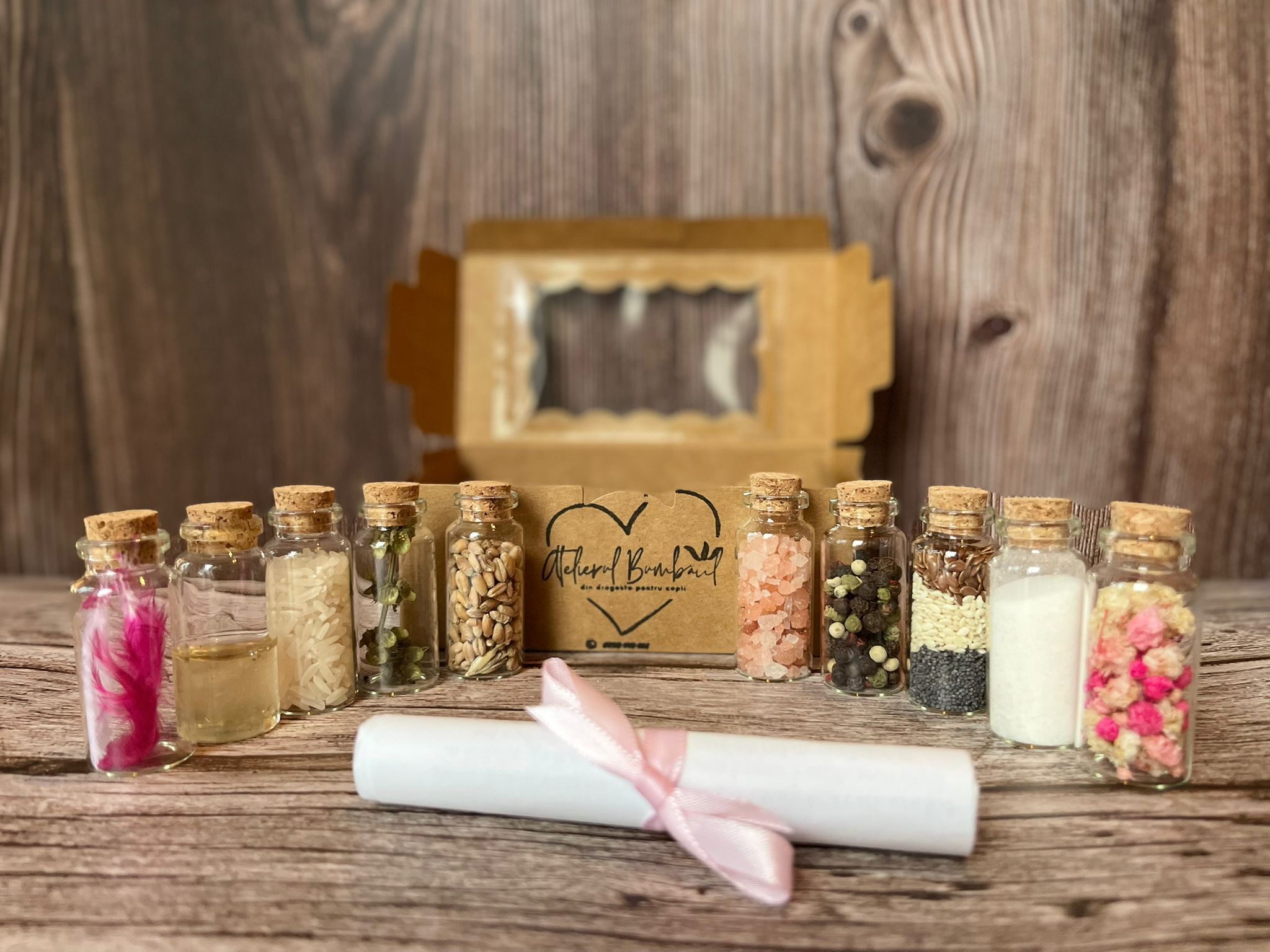 Setul vine insotit de 10 sticlute de 10ml cu mirodeniile necesare baiteti de mir si o foaie cu semnificatia fiecarui ingredient.