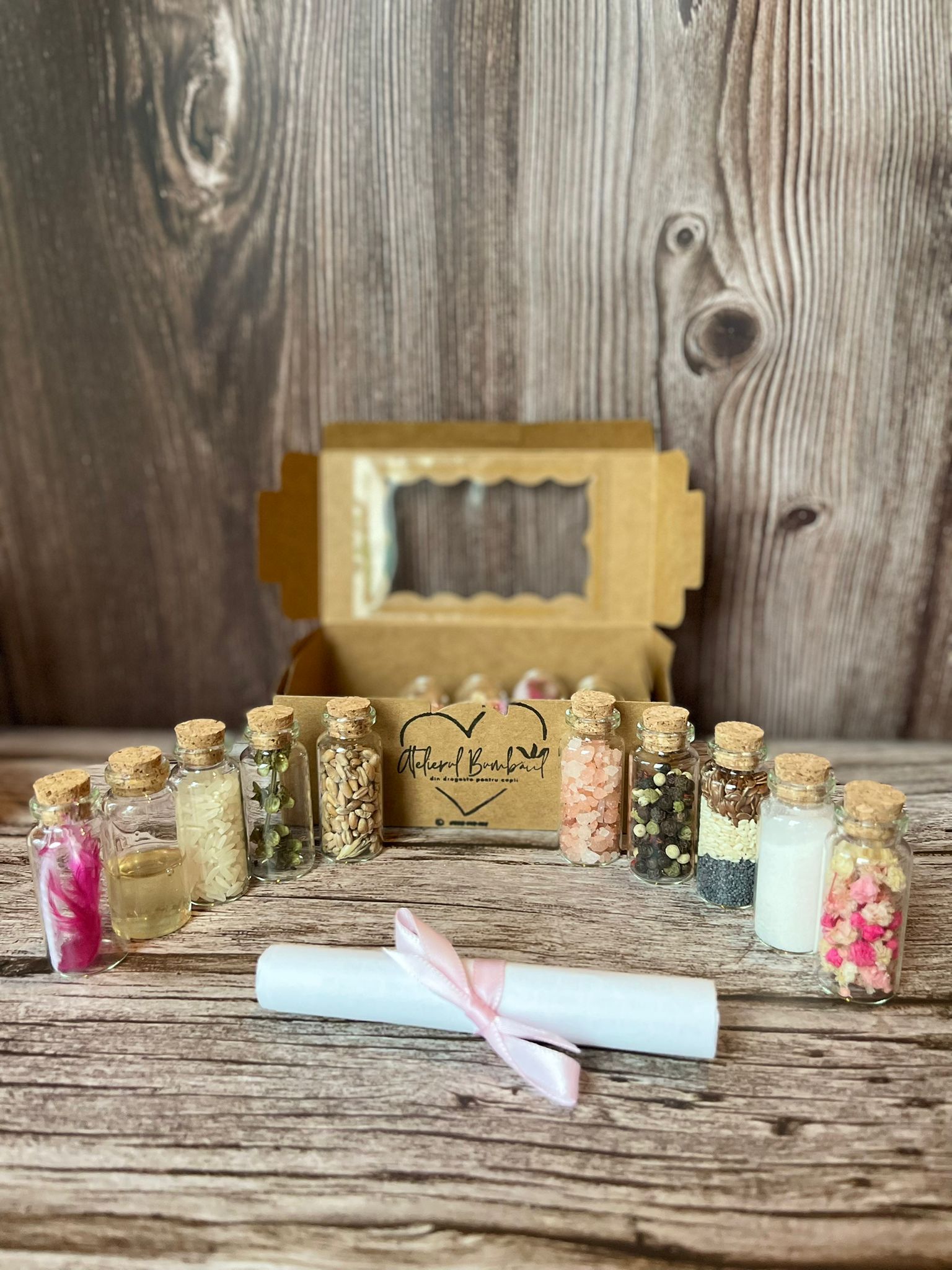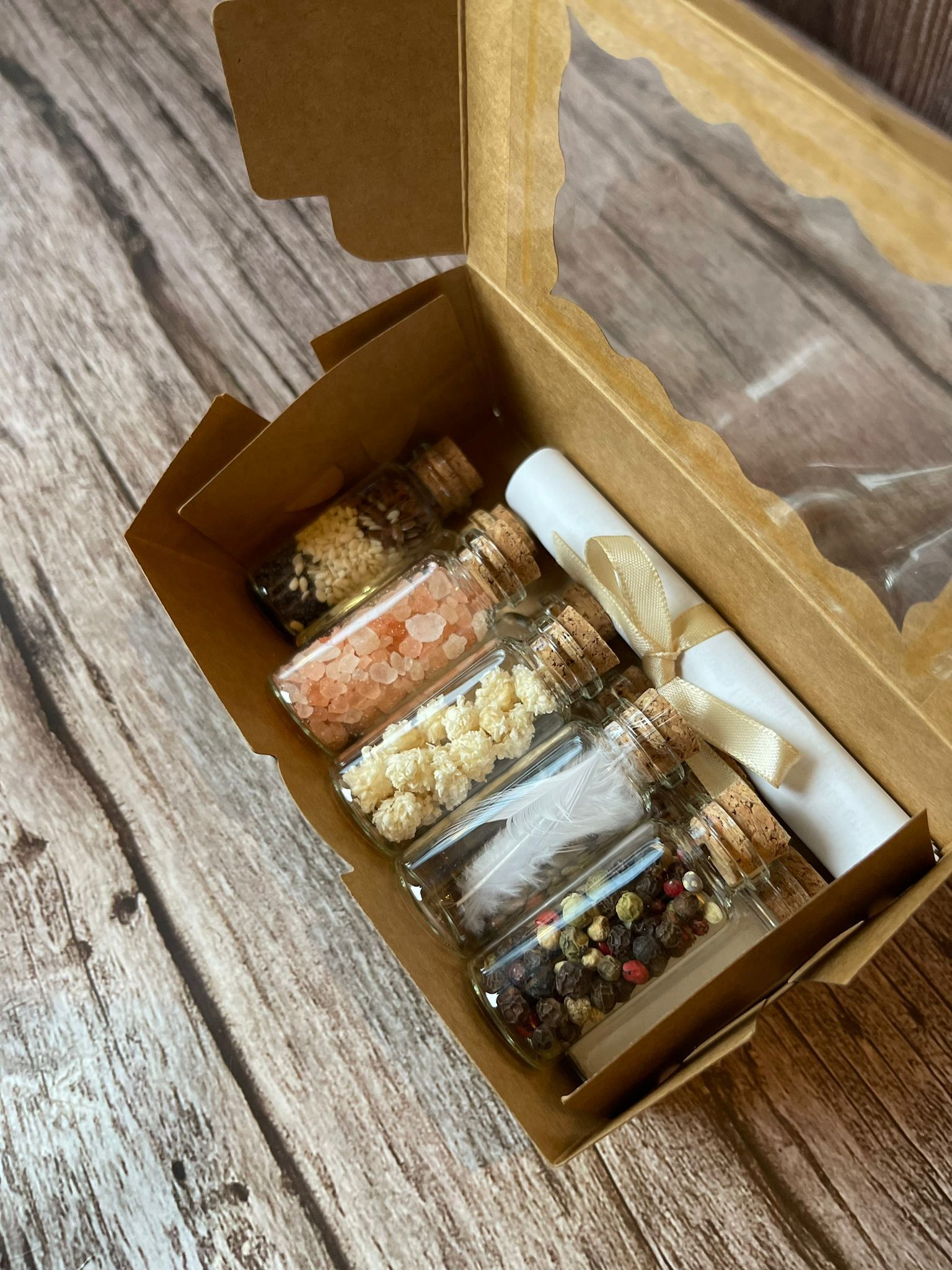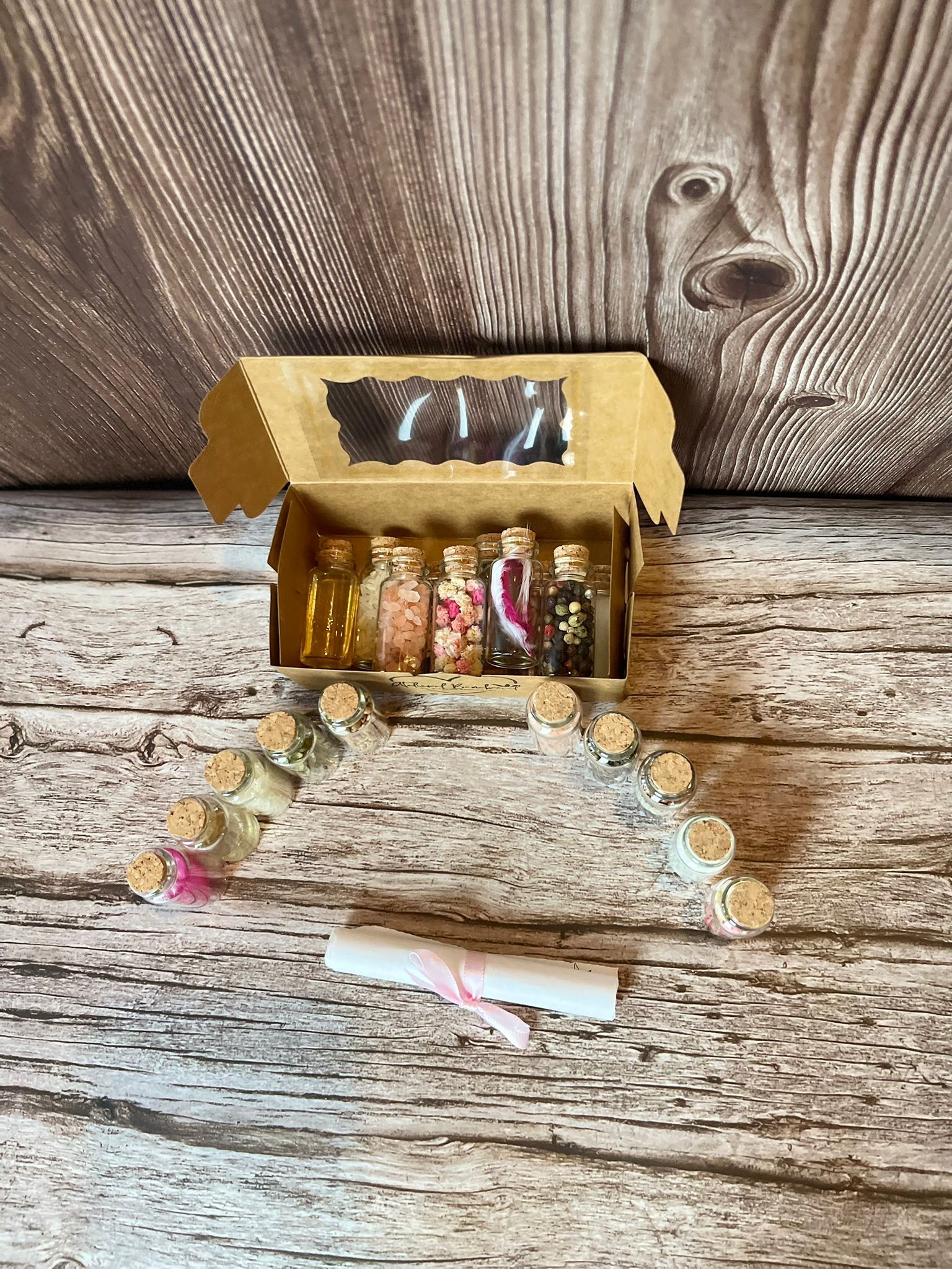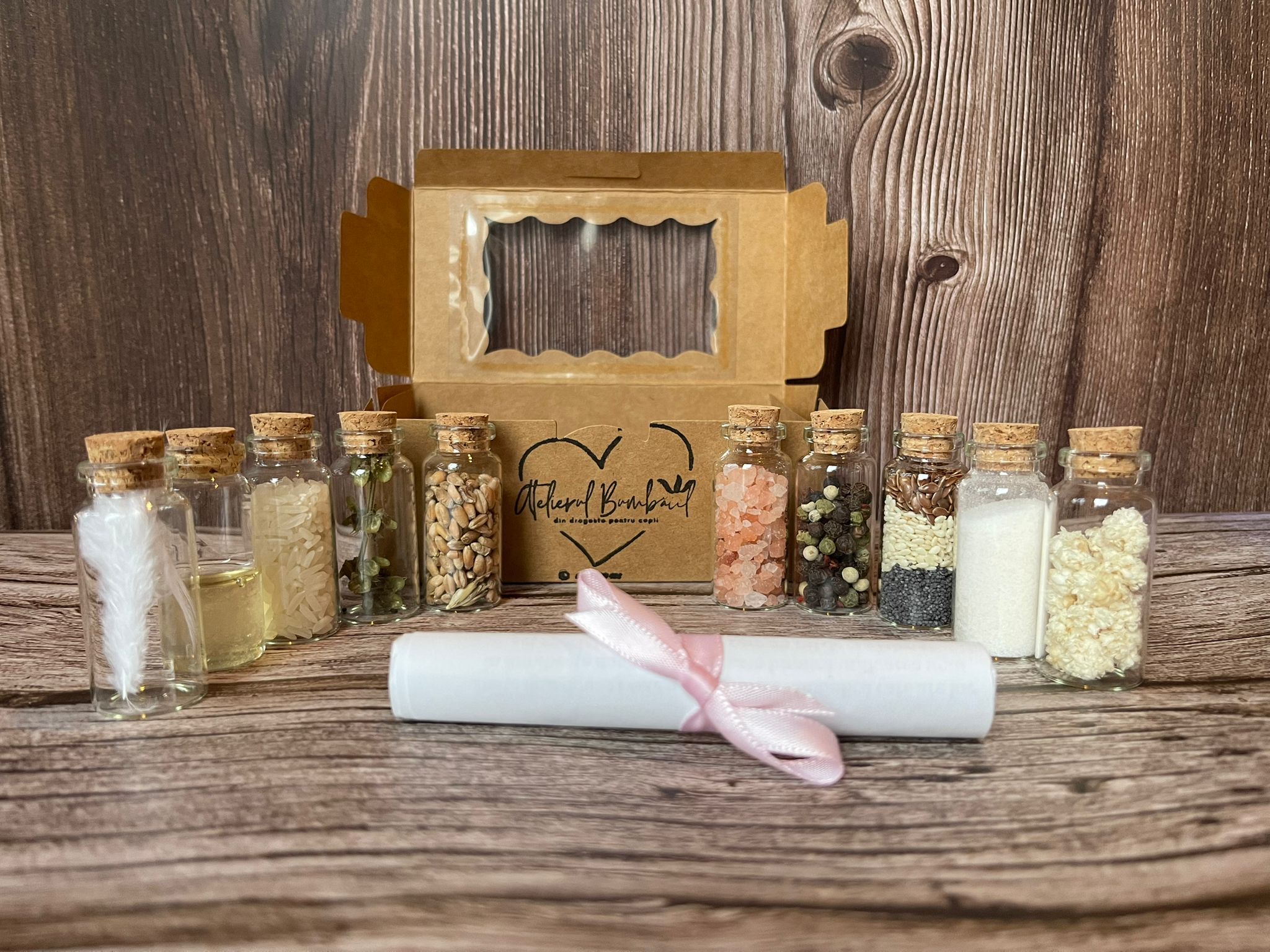 Setul vine insotit de 10 sticlute de 10ml cu mirodeniile necesare baiteti de mir si o foaie cu semnificatia fiecarui ingredient.