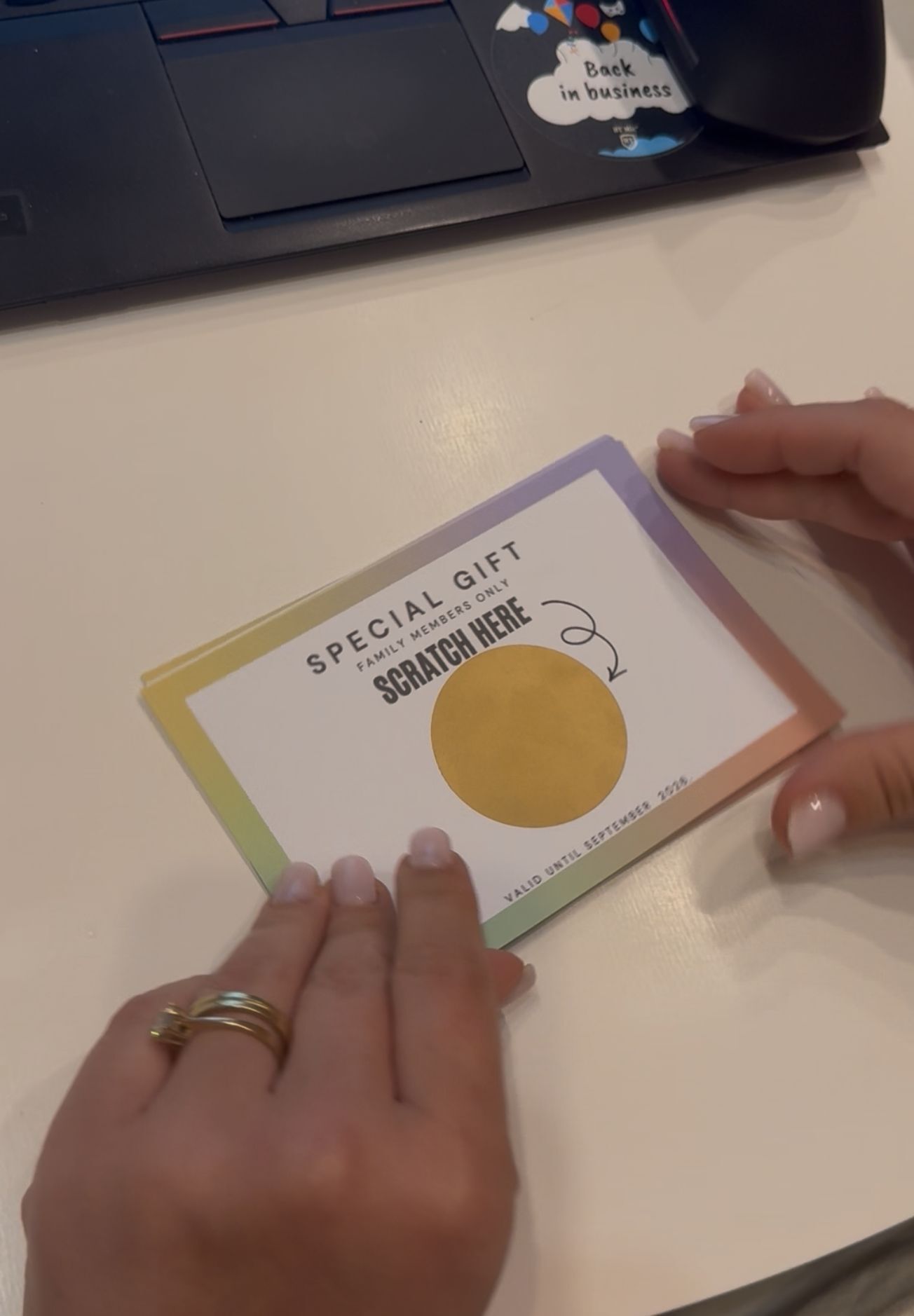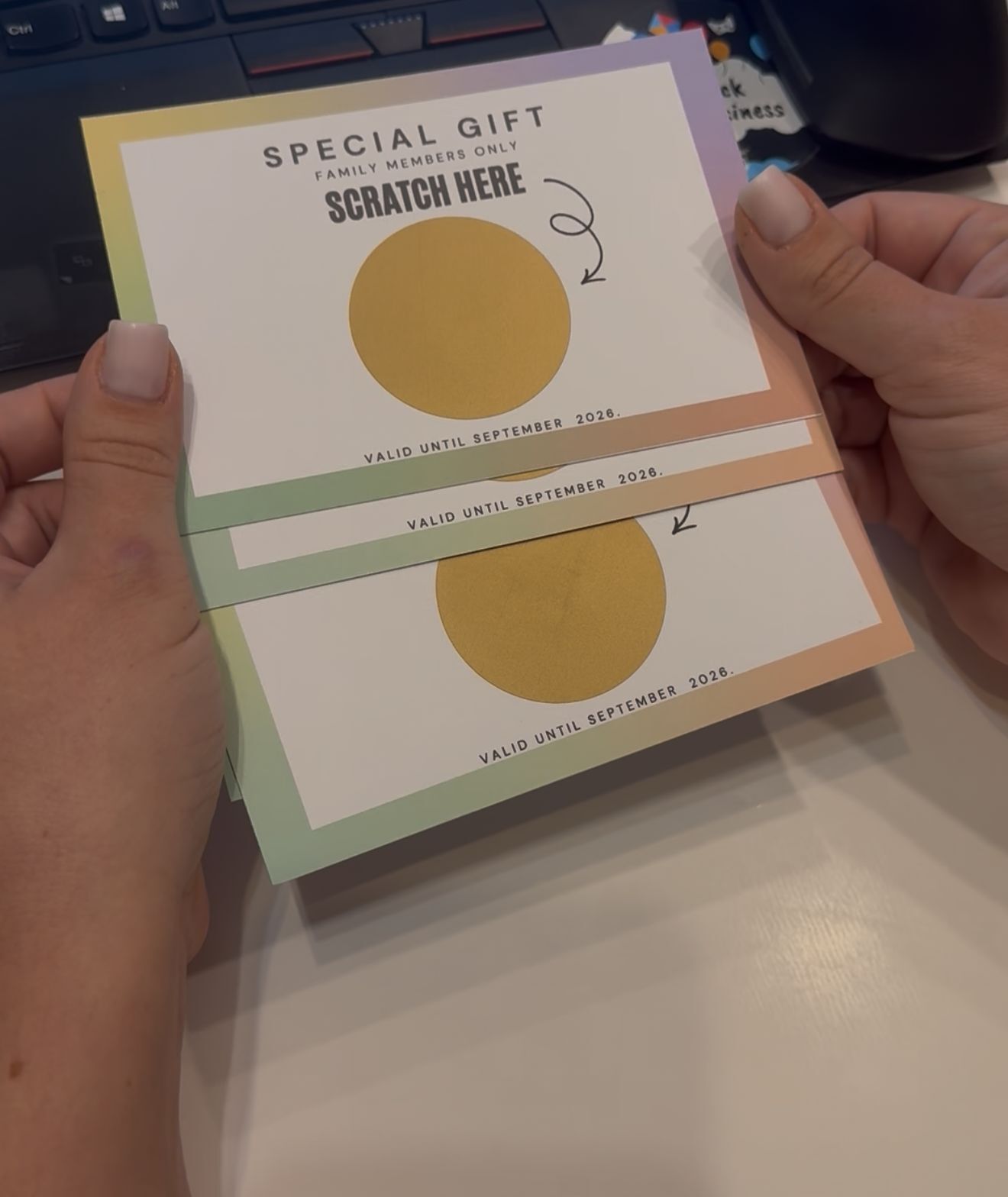 Felicitările răzuibile sunt o modalitate unică și interactivă de a surprinde persoanele dragi cu mesaje speciale. Fiecare felicitare include o zonă acoperită care poate fi răzuită pentru a dezvălui un mesaj personalizat plin de emoție. Perfecte pentru ocazii speciale, aceste felicitări adaugă un element de mister și bucurie fiecărei surprize. Creează momente memorabile într-un mod creativ și original cu aceste felicitări inedite.Spune-ne ce mesaj vrei sa transmiti si noi te ajutam cu grafica in functie de evenimentul tau.