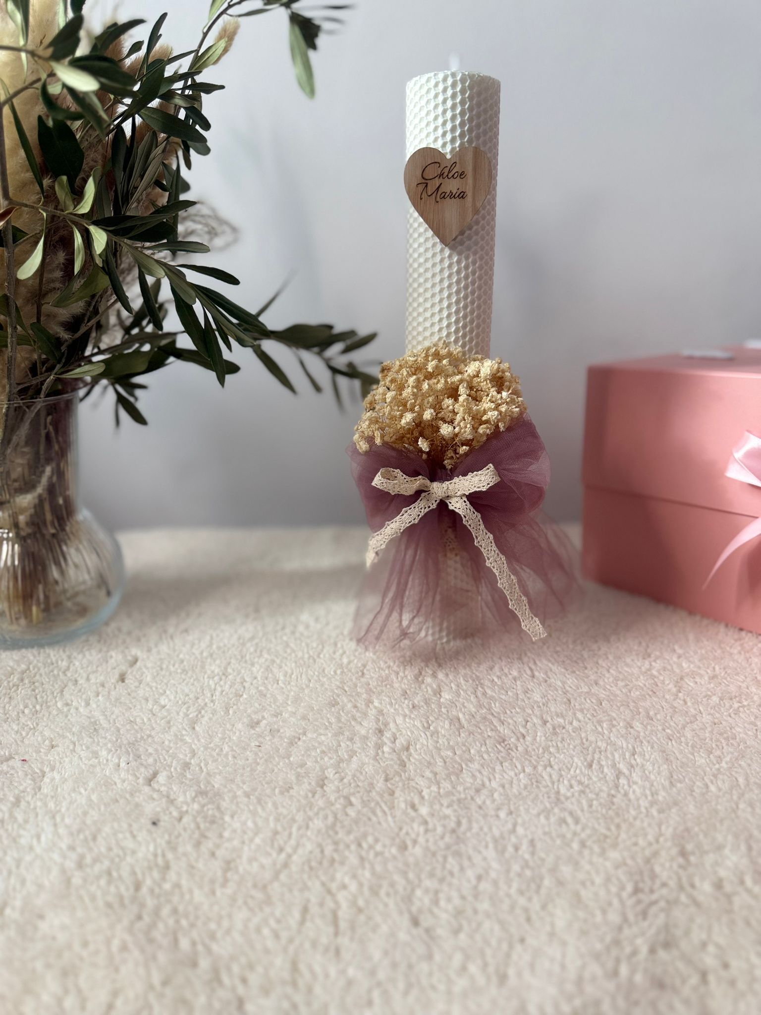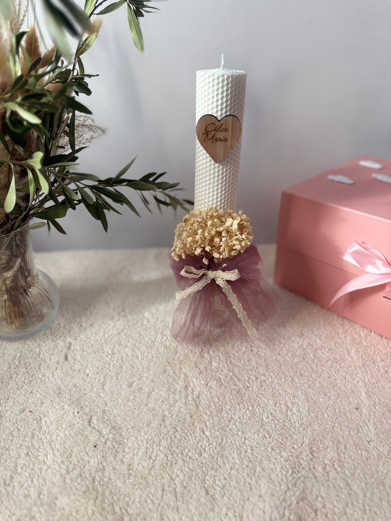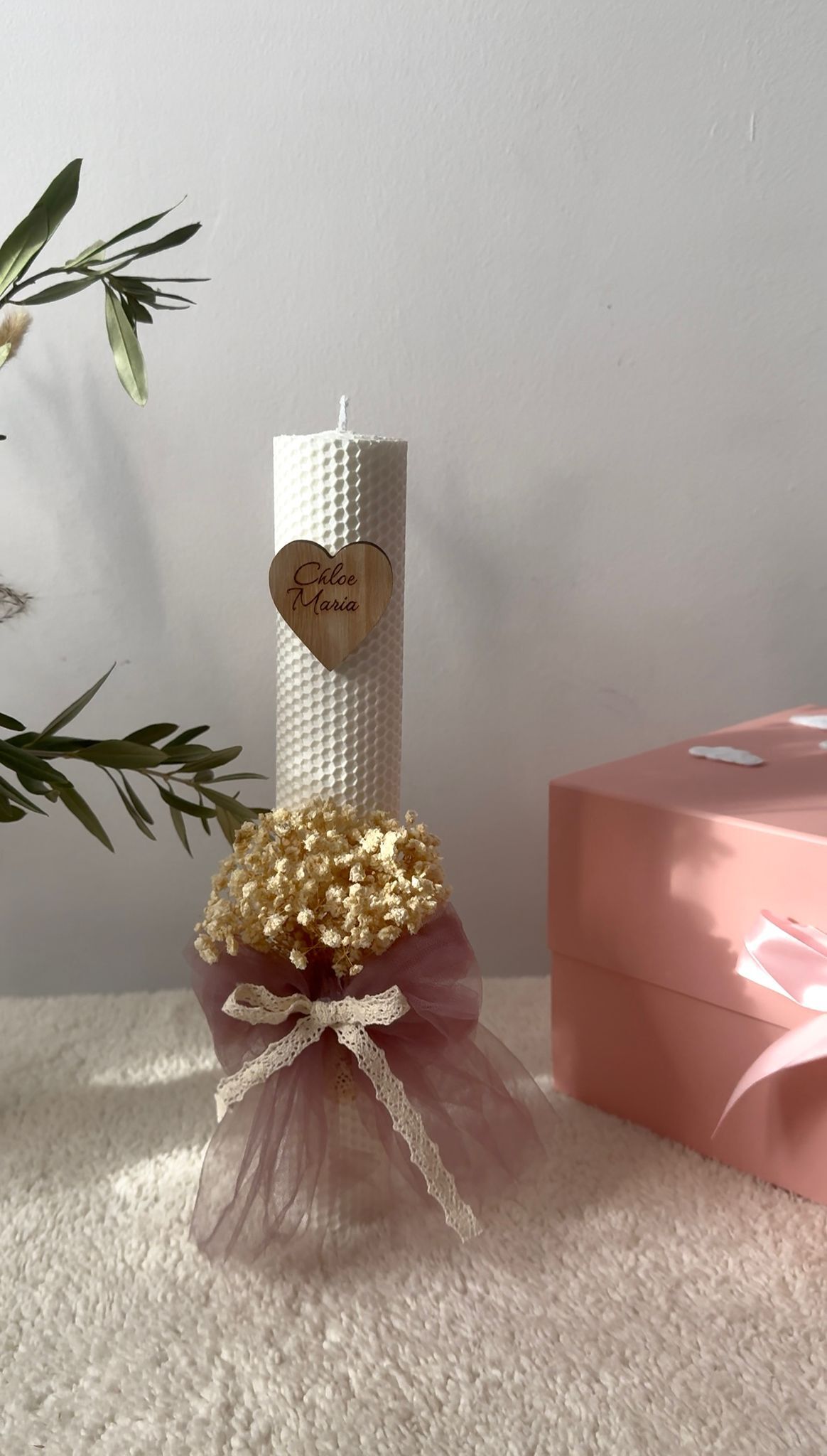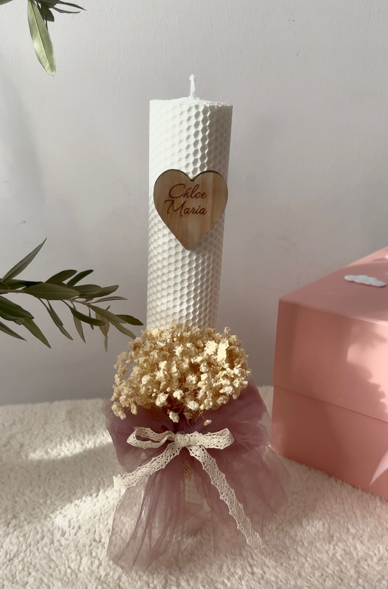 Lumanare de tip fagure , inaltime de 35 cm decorata cu flori gypsophila tull si panglica de bumbac personalizata cu nume scris pe inimioara de lemn . Se poate realiza pe o varietate de culori a materialelor ,florilor cat si a lumanarii .