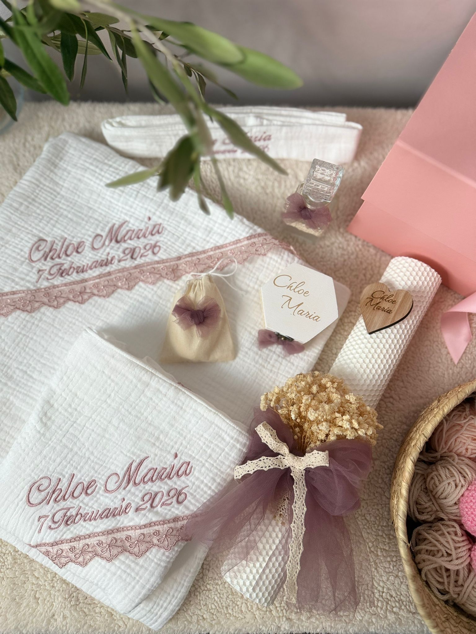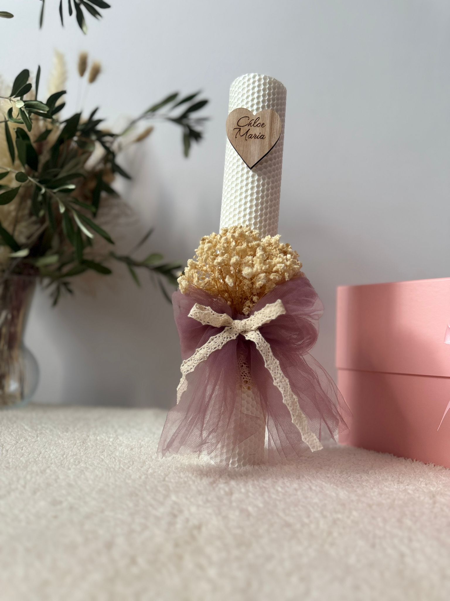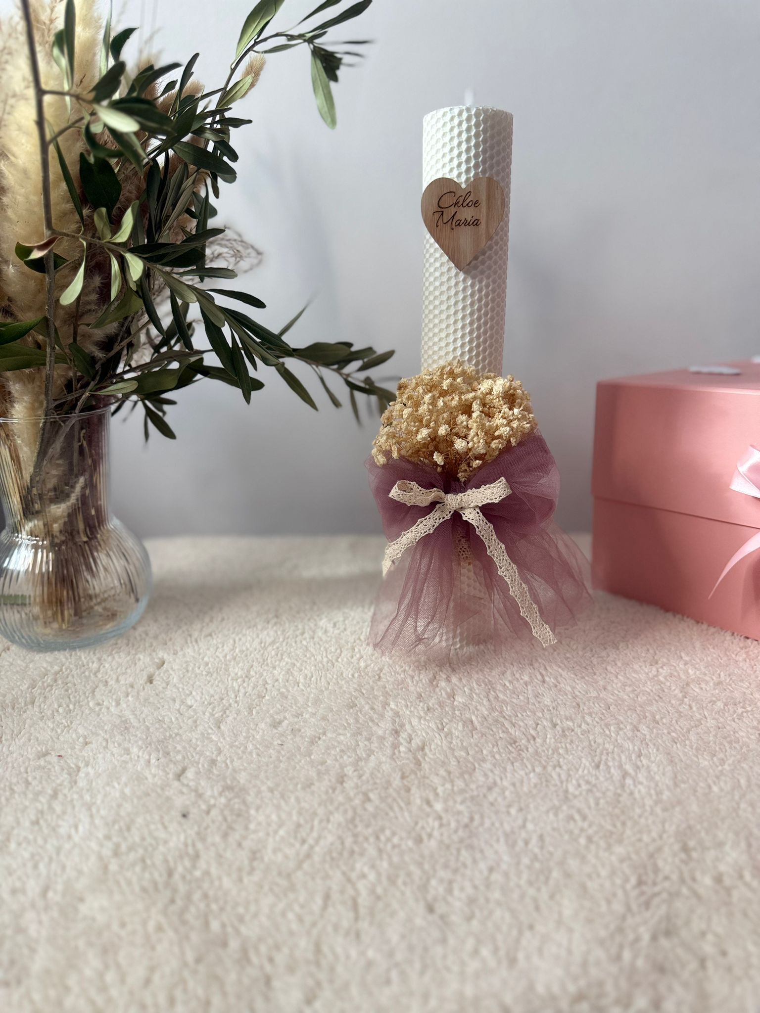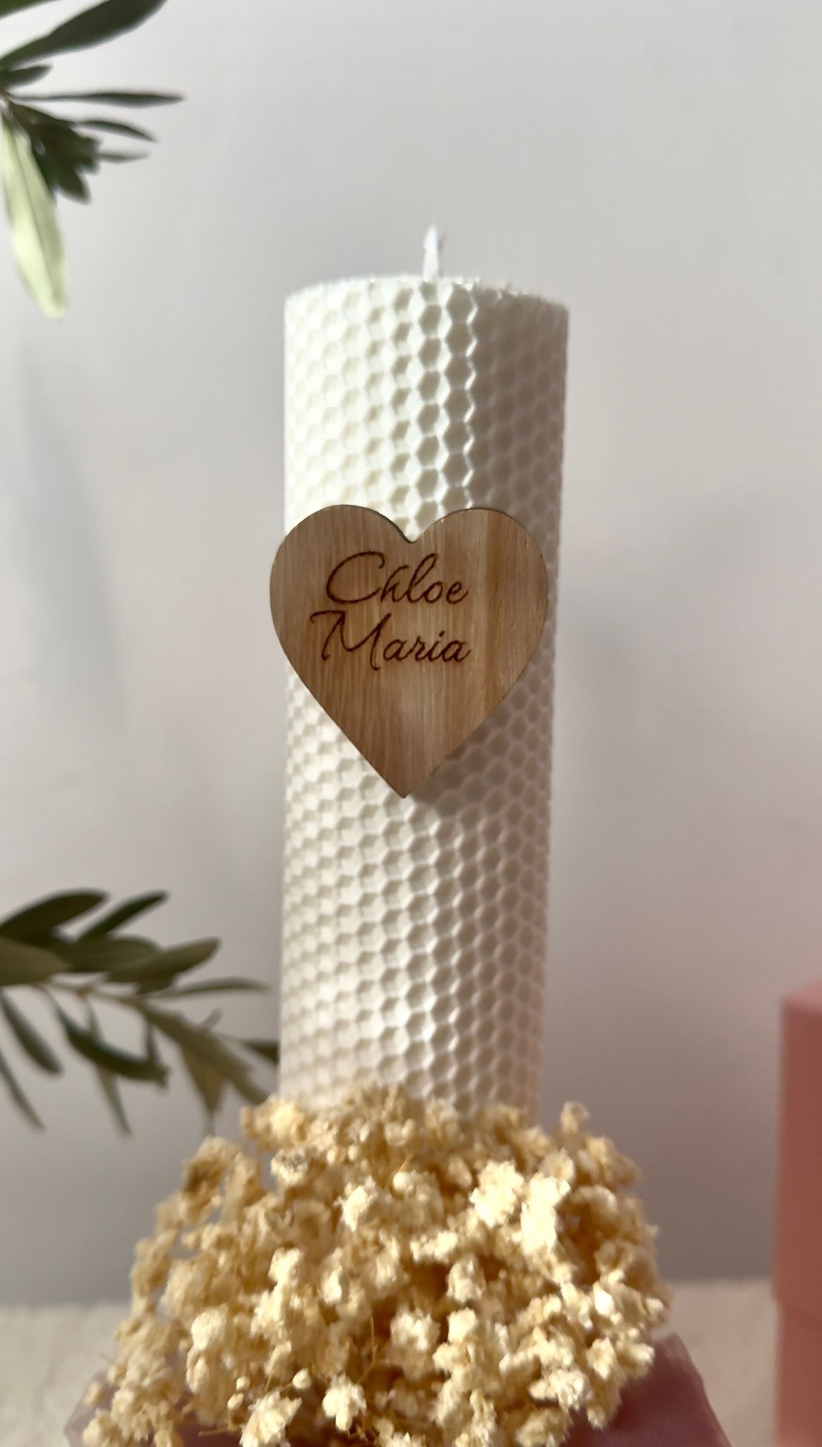Lumanare de tip fagure , inaltime de 35 cm decorata cu flori gypsophila tull si panglica de bumbac personalizata cu nume scris pe inimioara de lemn . Se poate realiza pe o varietate de culori a materialelor ,florilor cat si a lumanarii .