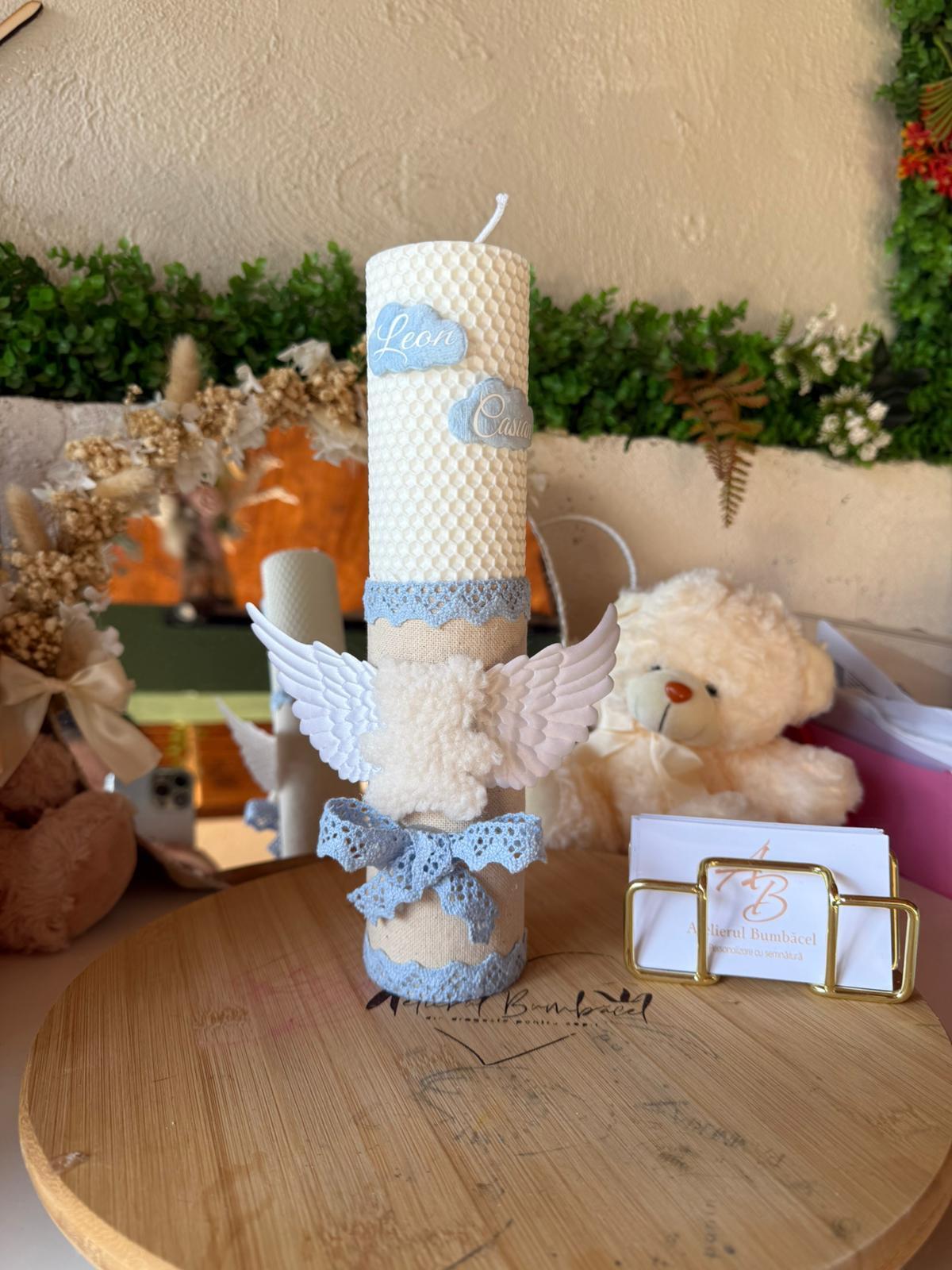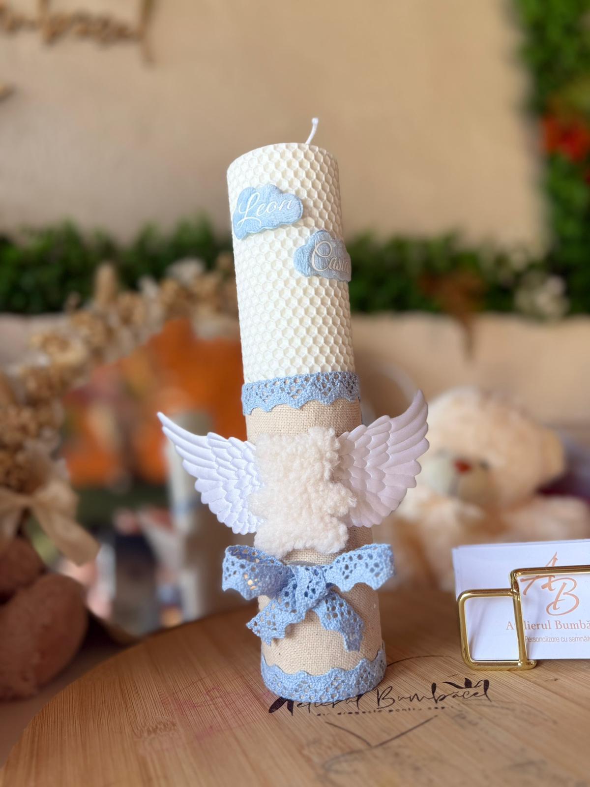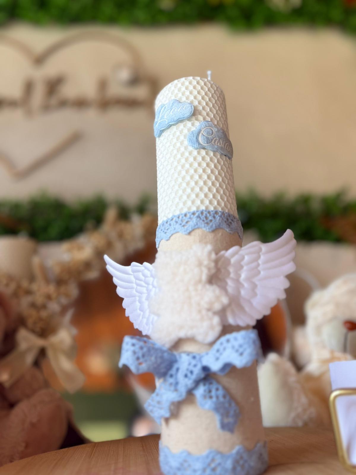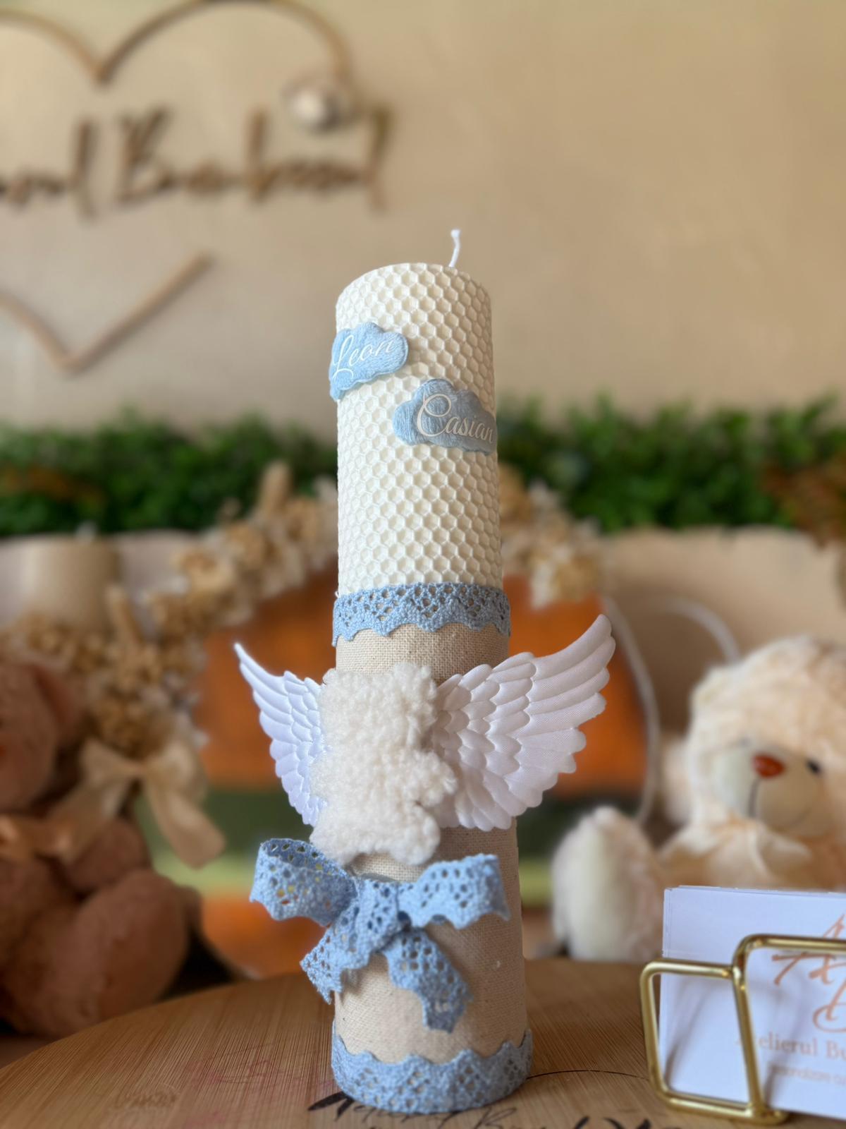 Lumânarea "Ursuleț cu aripi înger" este un simbol delicat al purității și iubirii. Realizată cu grijă din materiale de calitate, această lumânare aduce un strop de magie și căldură în orice decor. Designul său unic, în formă de ursuleț cu aripi, o face ideală pentru evenimente speciale sau momente de reflecție. Este un cadou deosebit, perfect pentru a crea amintiri pline de emoție. Norisorii se pot personaliza cu numele copilului.Lumânarea are dimensiunea de 26 cm.