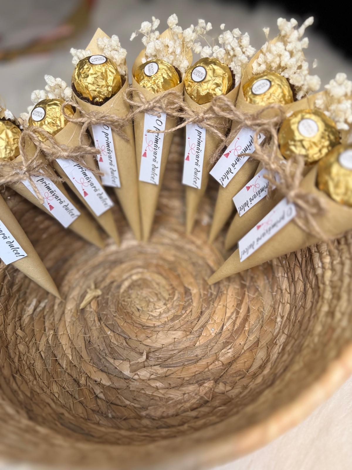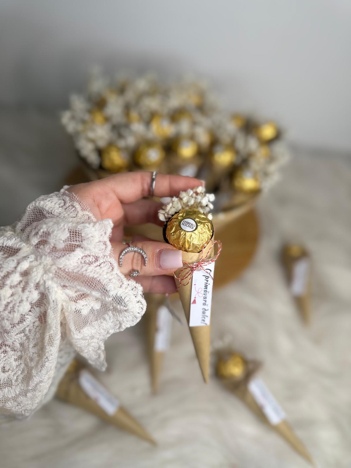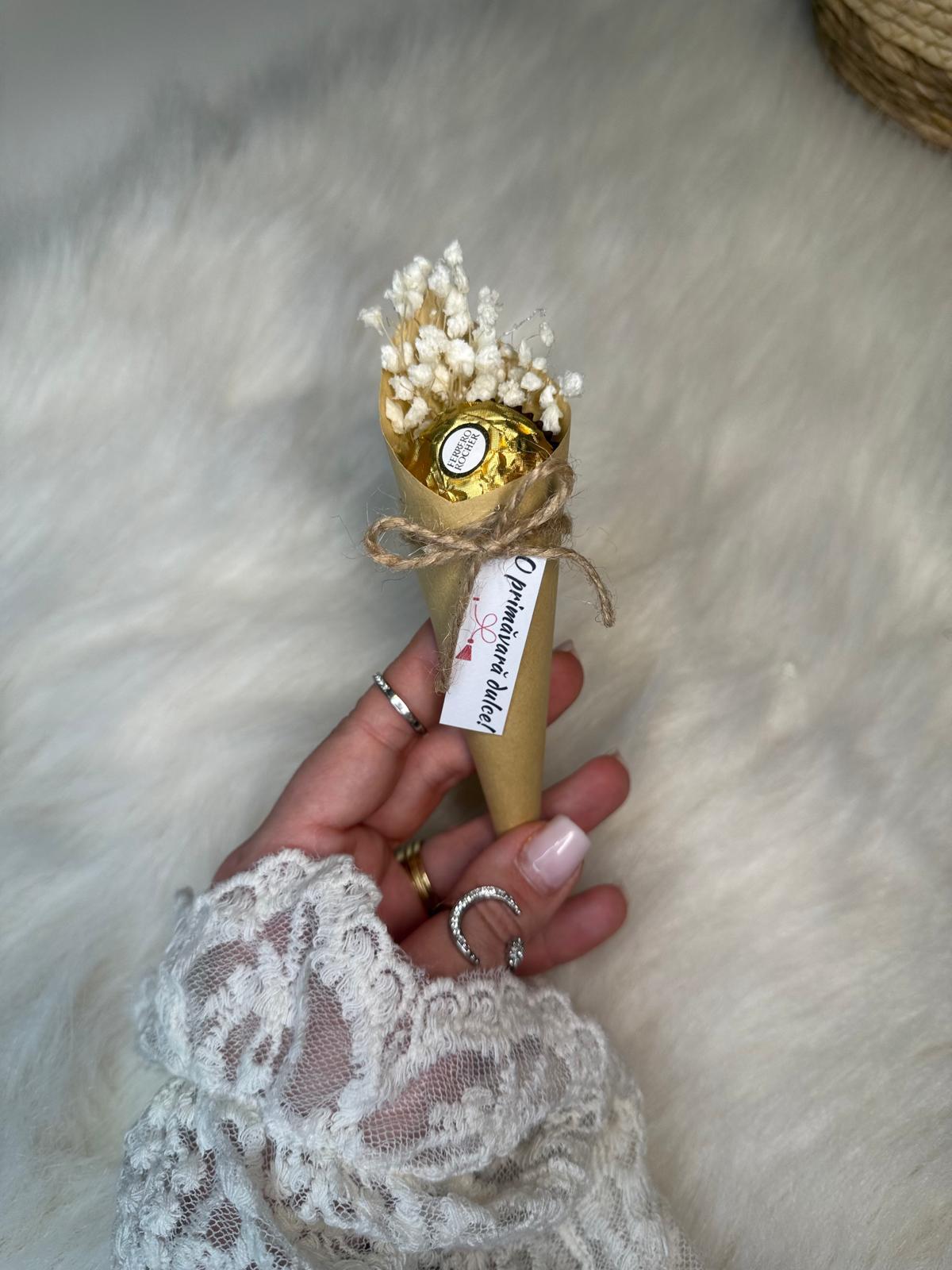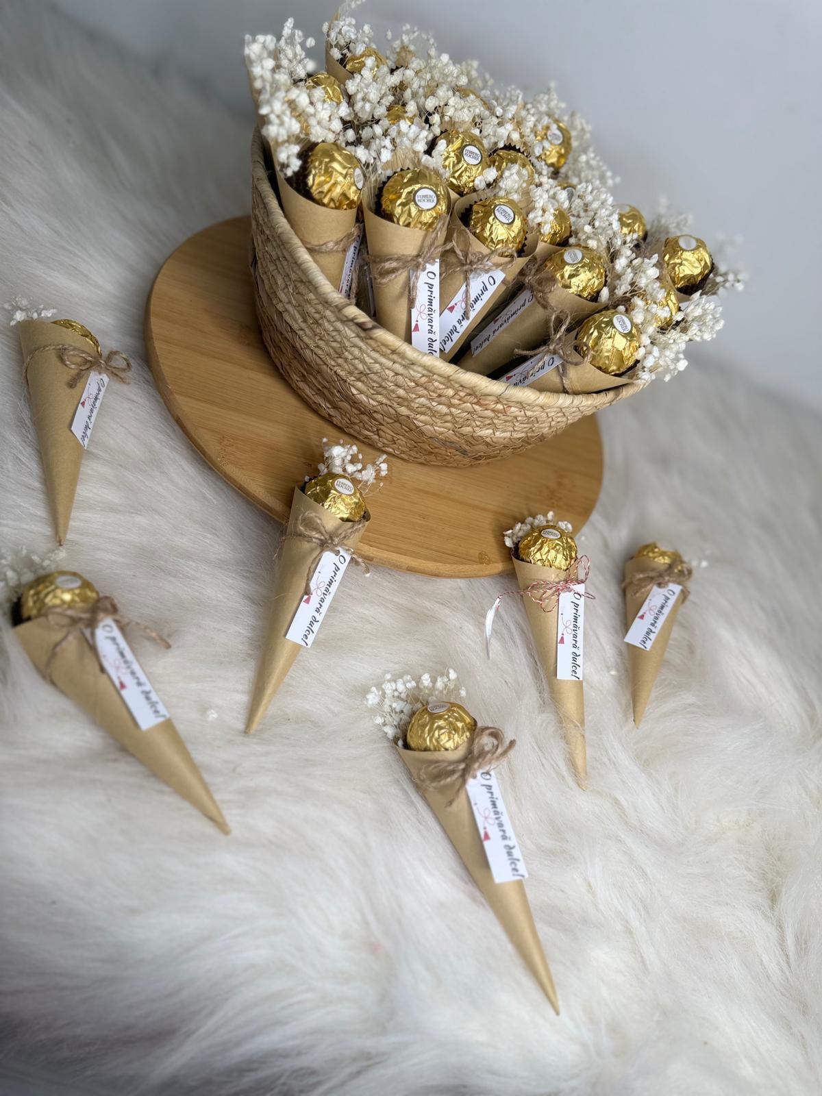 Martisorul cornet Ferrero este mărțisorul perfect diferit pentru a sărbători începutul primăverii. Acest produs delicat combină eleganța tradiționalului șnur de mărțișor,cornet din hârtie craft ,floricele albe cu savoarea inconfundabilă a ciocolatei fine Ferrero. Fiecare bucată oferă o explozie de gust rafinat, fiind ambalată cu grijă pentru a aduce bucurie celor dragi. Alege mărțișor pentru un gest plin de rafinament și simbolistică.