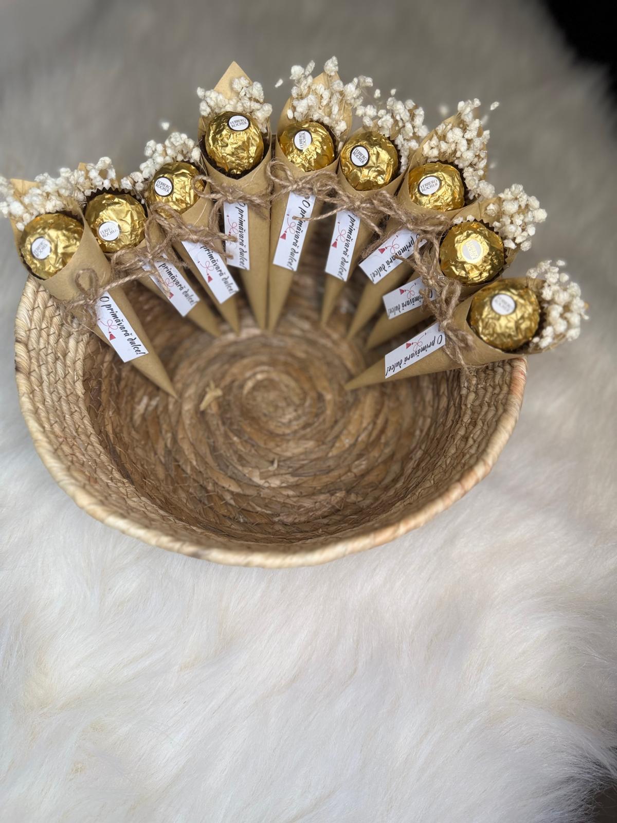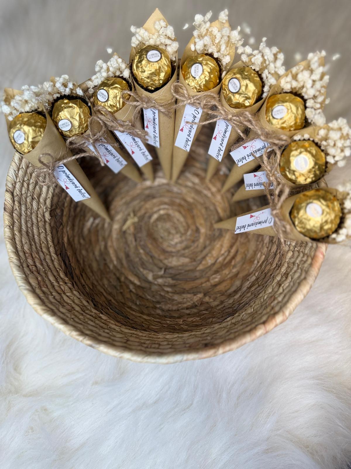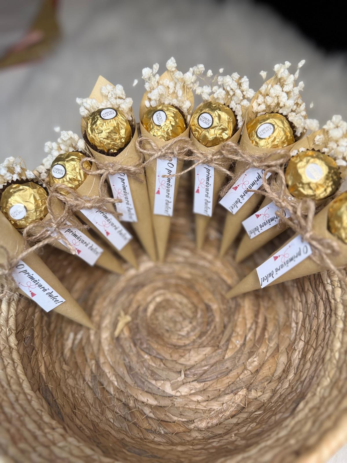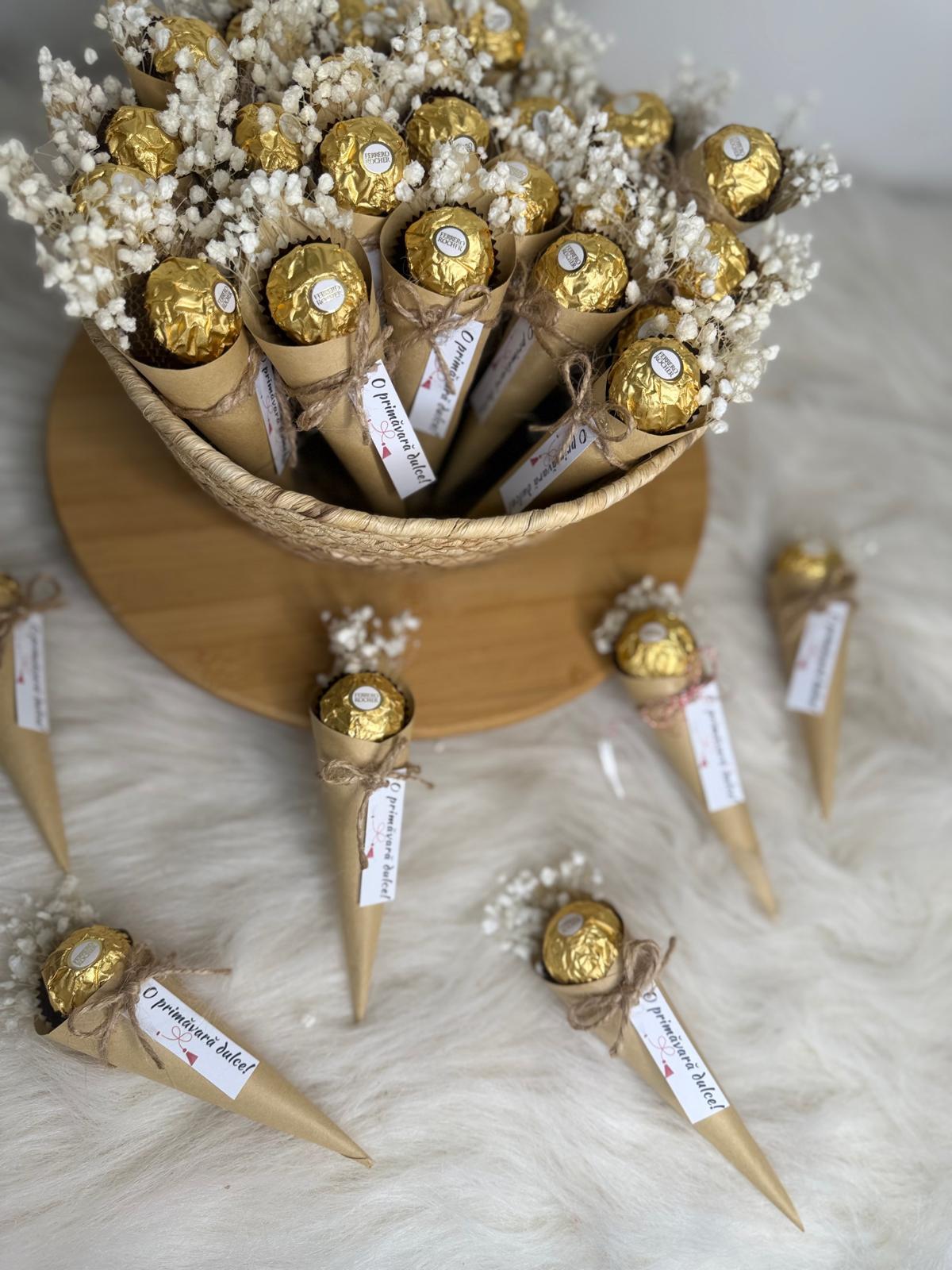 Martisorul cornet Ferrero este mărțisorul perfect diferit pentru a sărbători începutul primăverii. Acest produs delicat combină eleganța tradiționalului șnur de mărțișor,cornet din hârtie craft ,floricele albe cu savoarea inconfundabilă a ciocolatei fine Ferrero. Fiecare bucată oferă o explozie de gust rafinat, fiind ambalată cu grijă pentru a aduce bucurie celor dragi. Alege mărțișor pentru un gest plin de rafinament și simbolistică.
