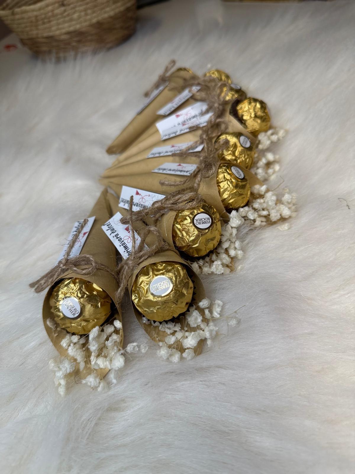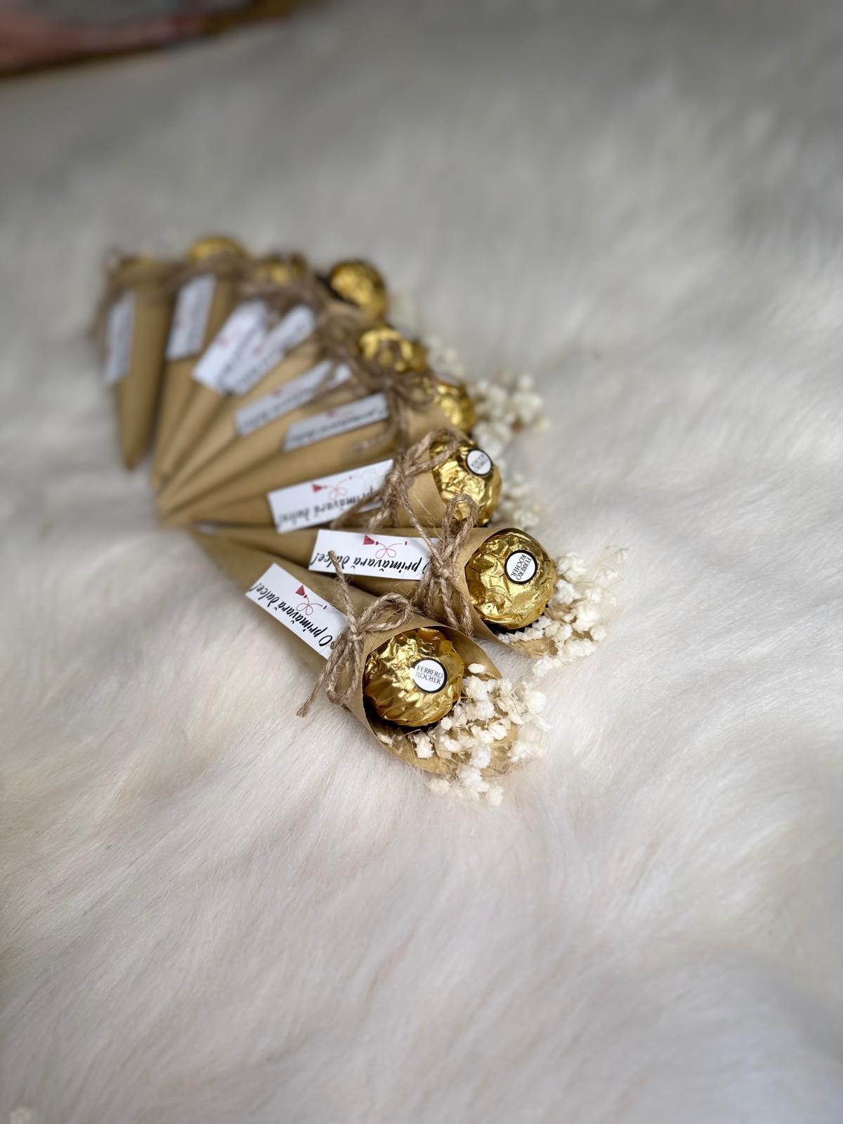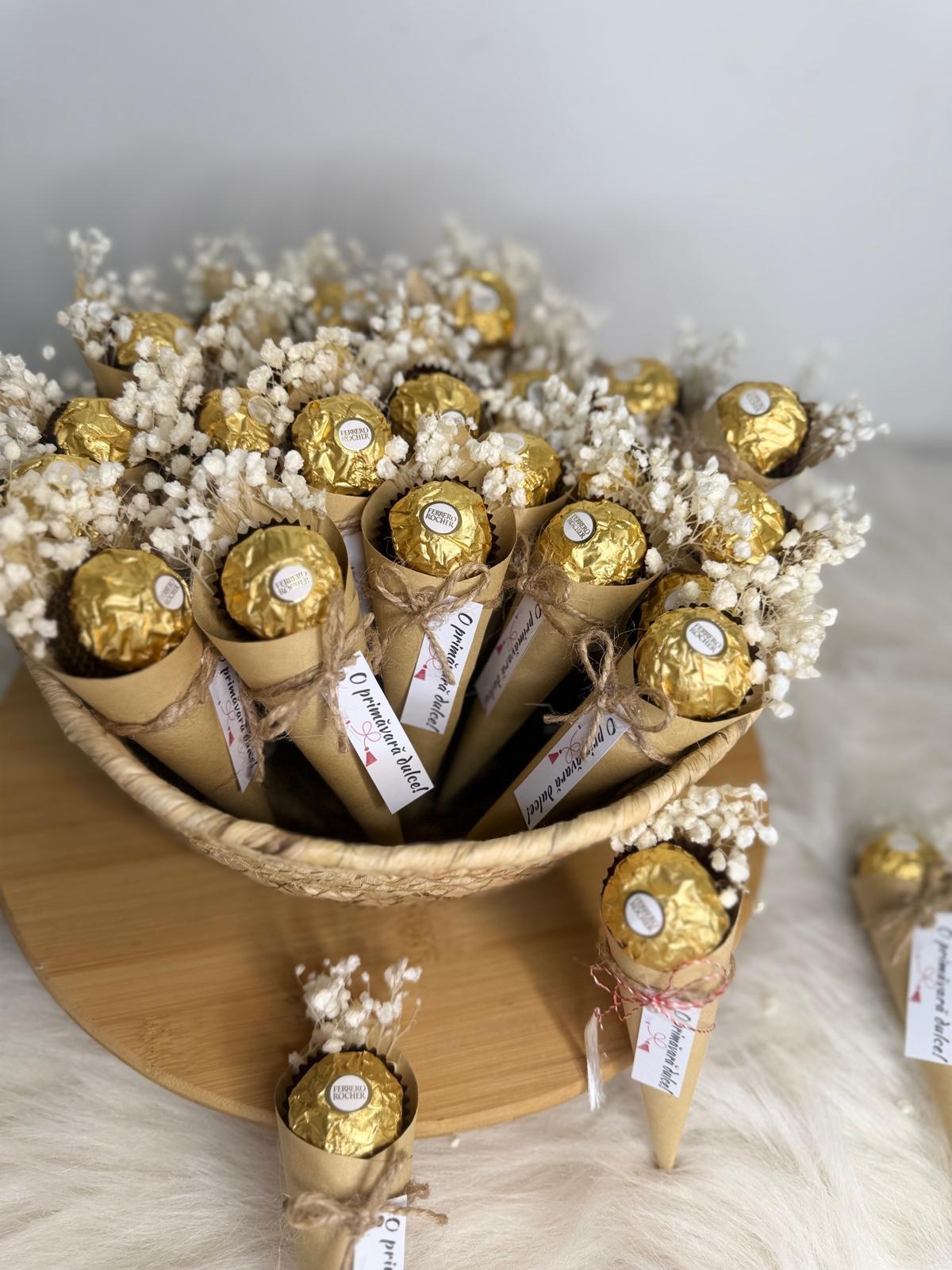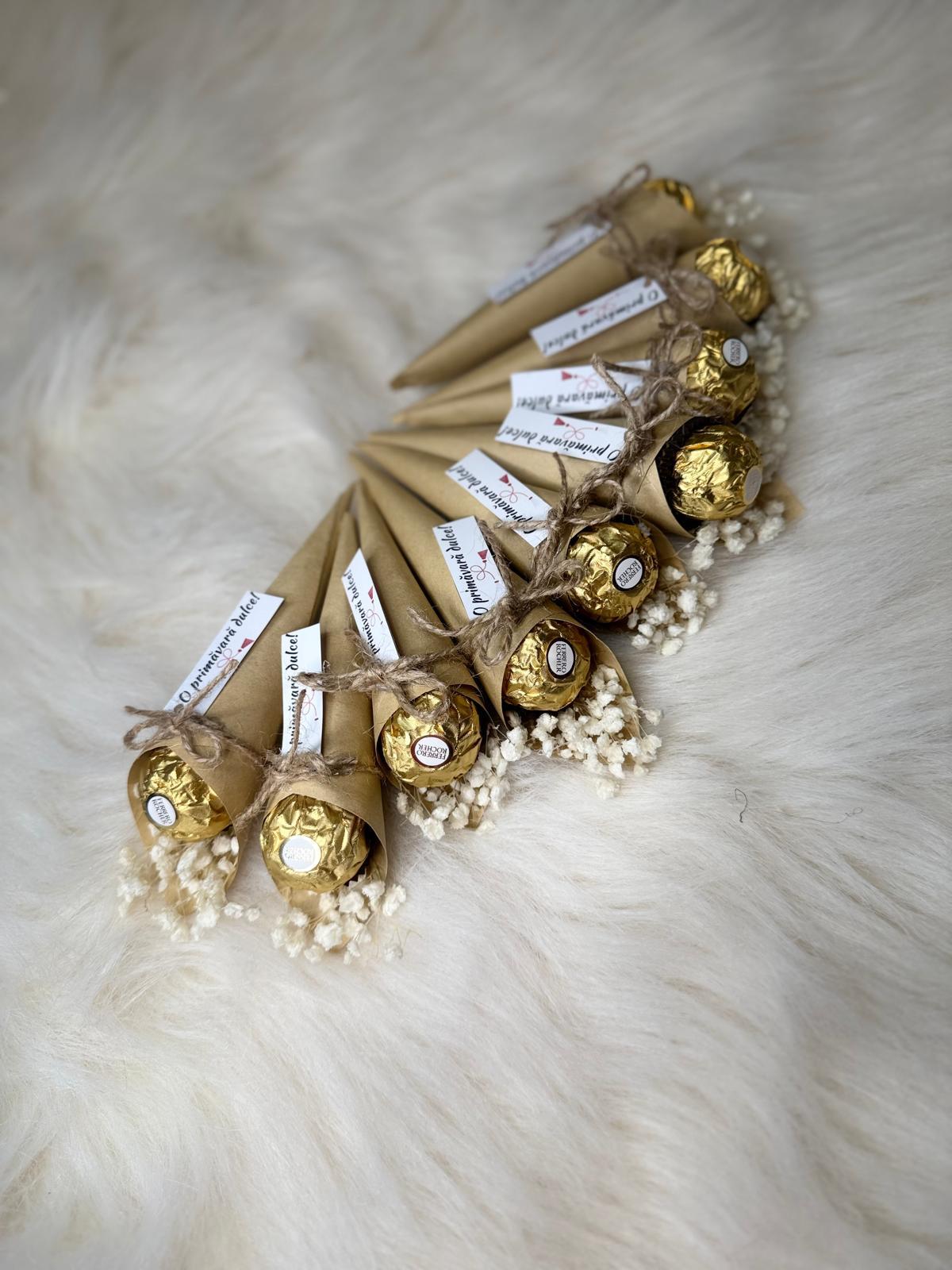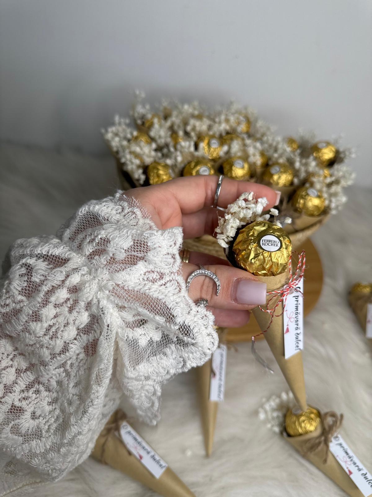 Martisorul cornet Ferrero este mărțisorul perfect diferit pentru a sărbători începutul primăverii. Acest produs delicat combină eleganța tradiționalului șnur de mărțișor,cornet din hârtie craft ,floricele albe cu savoarea inconfundabilă a ciocolatei fine Ferrero. Fiecare bucată oferă o explozie de gust rafinat, fiind ambalată cu grijă pentru a aduce bucurie celor dragi. Alege mărțișor pentru un gest plin de rafinament și simbolistică.
