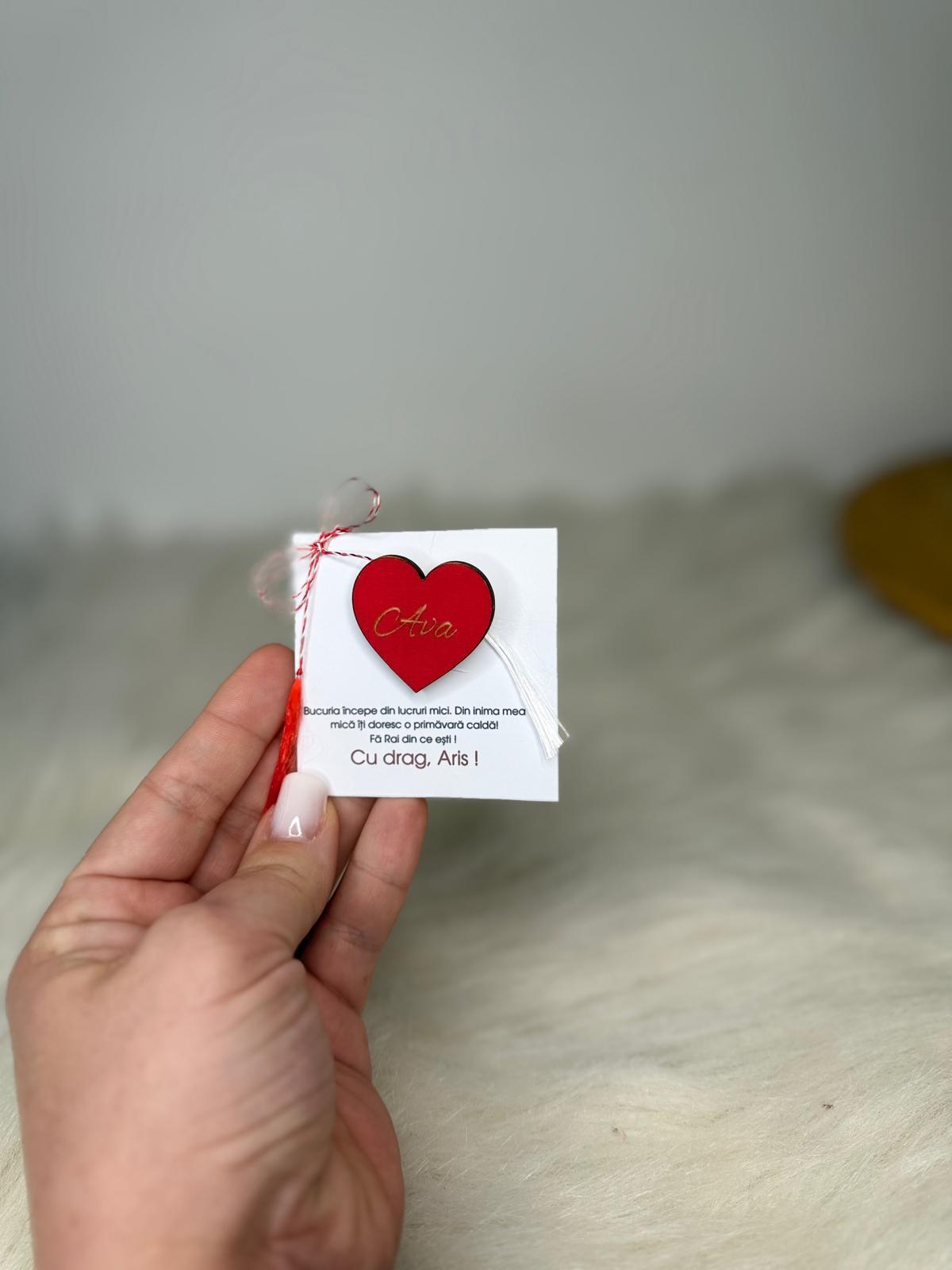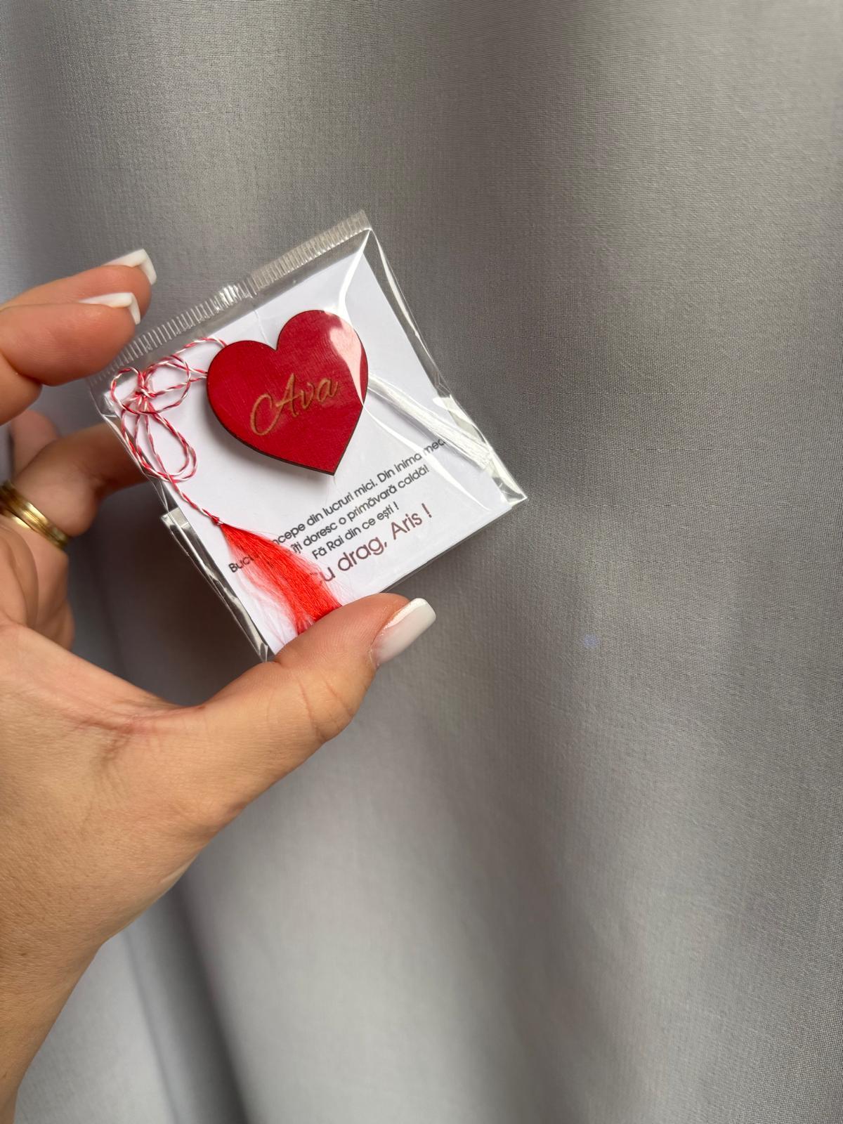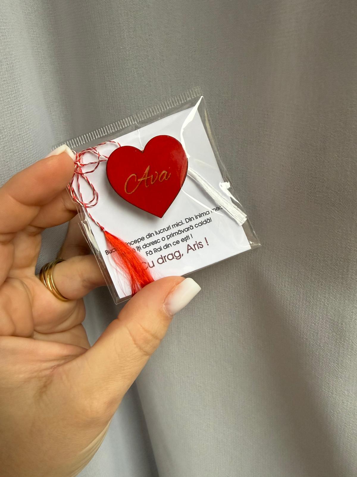 Alte specificații : Mărțișorul este in totalitate personalizabil , de la textul de pe cartonaș până la inimioară. Mărțișoarele se realizează pe comandă în limita timpului disponibil . Dimensiunea inimioarei este de 3,5 cm lățime cu aproximativ 3,5 cm înălțime.Termenul de executie poate să dureze până la 2 săptămâni in perioada mărțișorului.De asemenea de rezervăm dreptul de a refuza comenzile ce nu vor putea fi onorate in timp util , aceste aspecte fiind comunicate la contactarea telefonică a clientului pentru confirmarea comenzii.