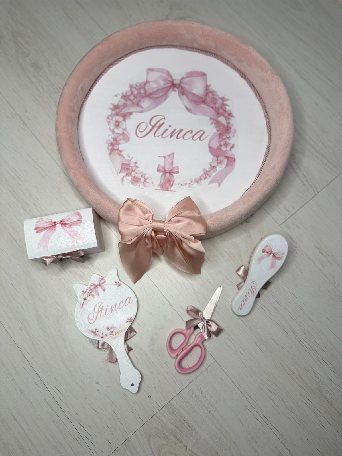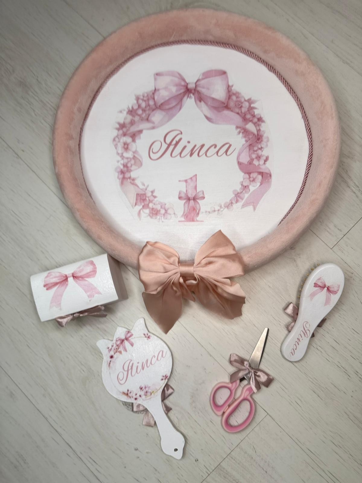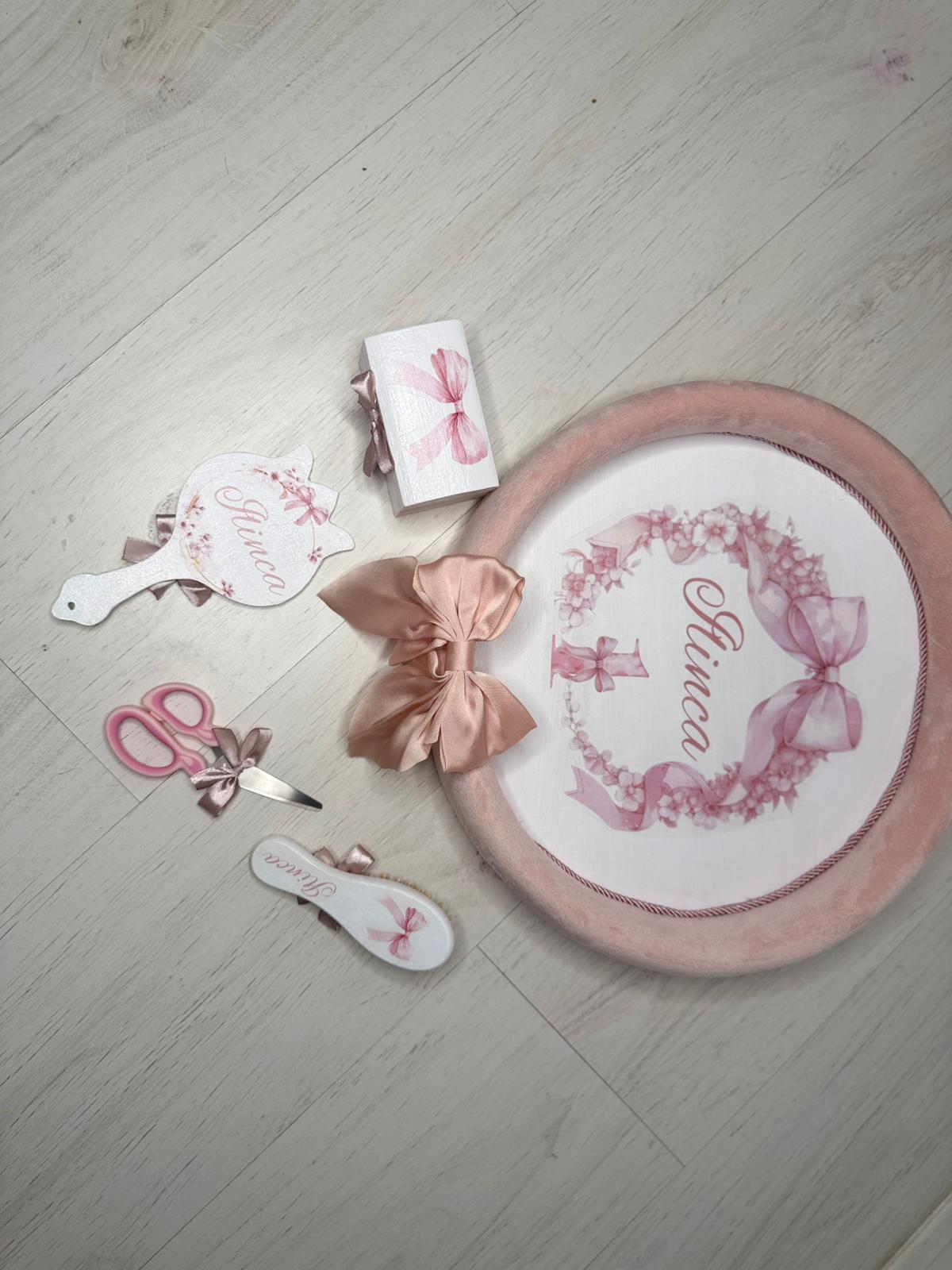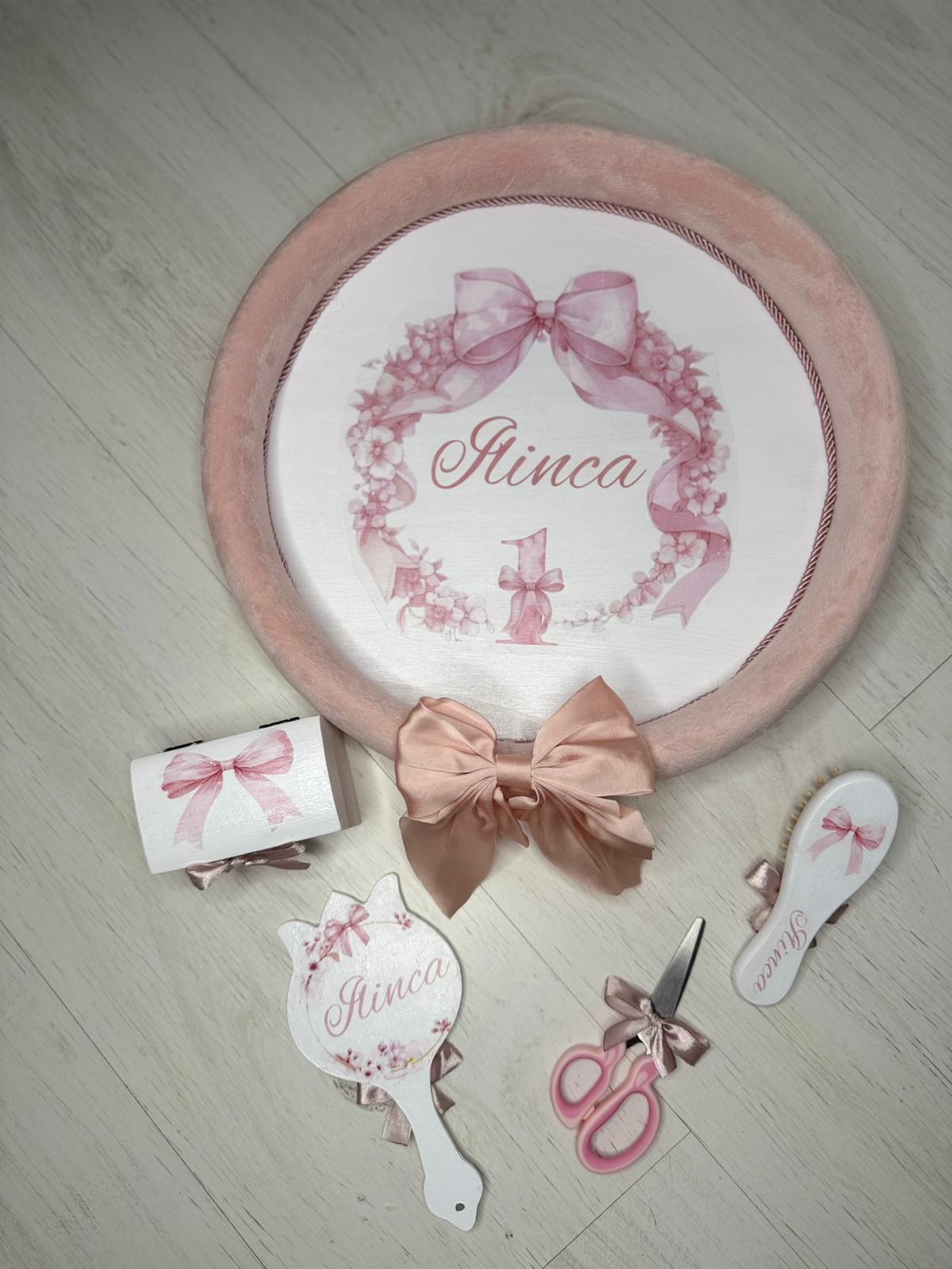 Setul conține: Tăviță din catifea cu diametru de 30 cm, perie , oglindă, foarfecă , cufăr pentru suvită si panglică pentru legarea suviței. Tăvița si accesoriile sunt realizate prin transfer de imagine .