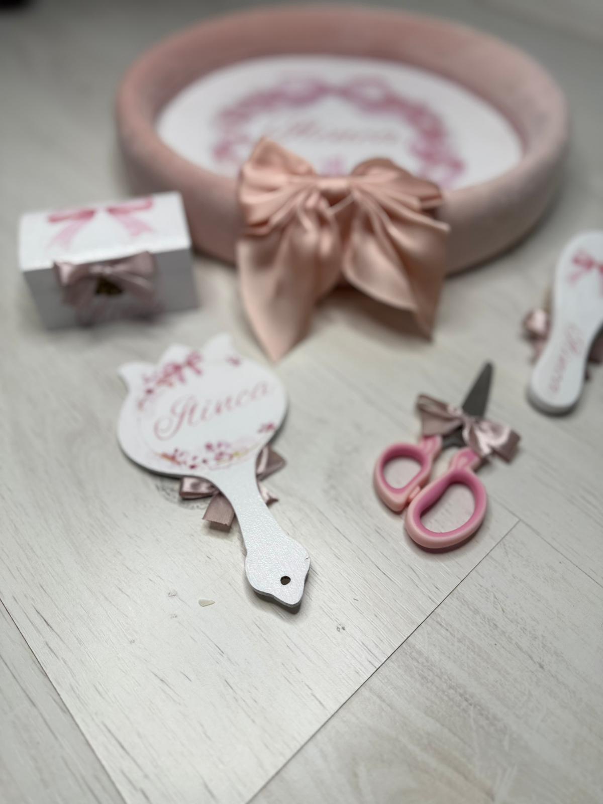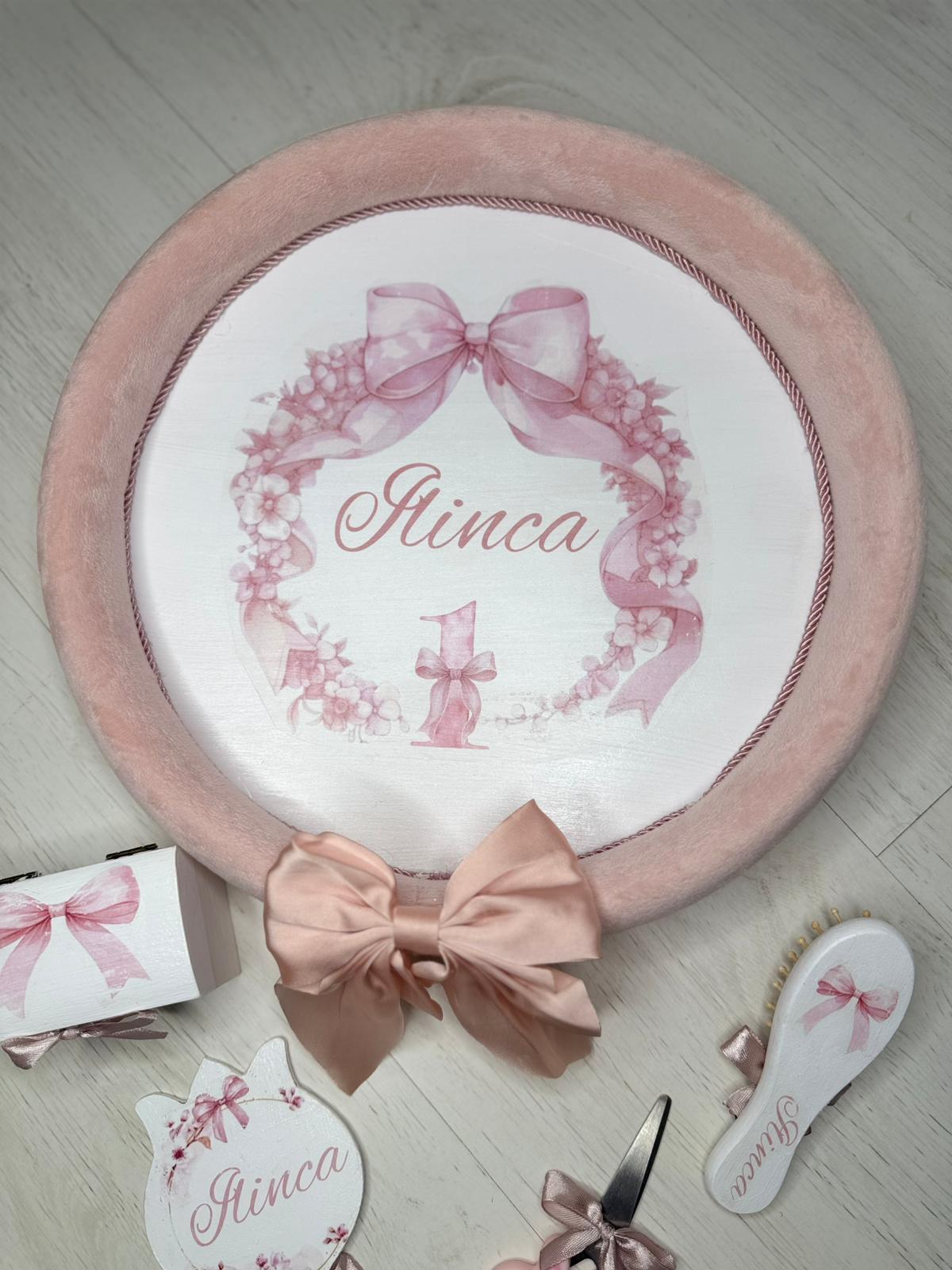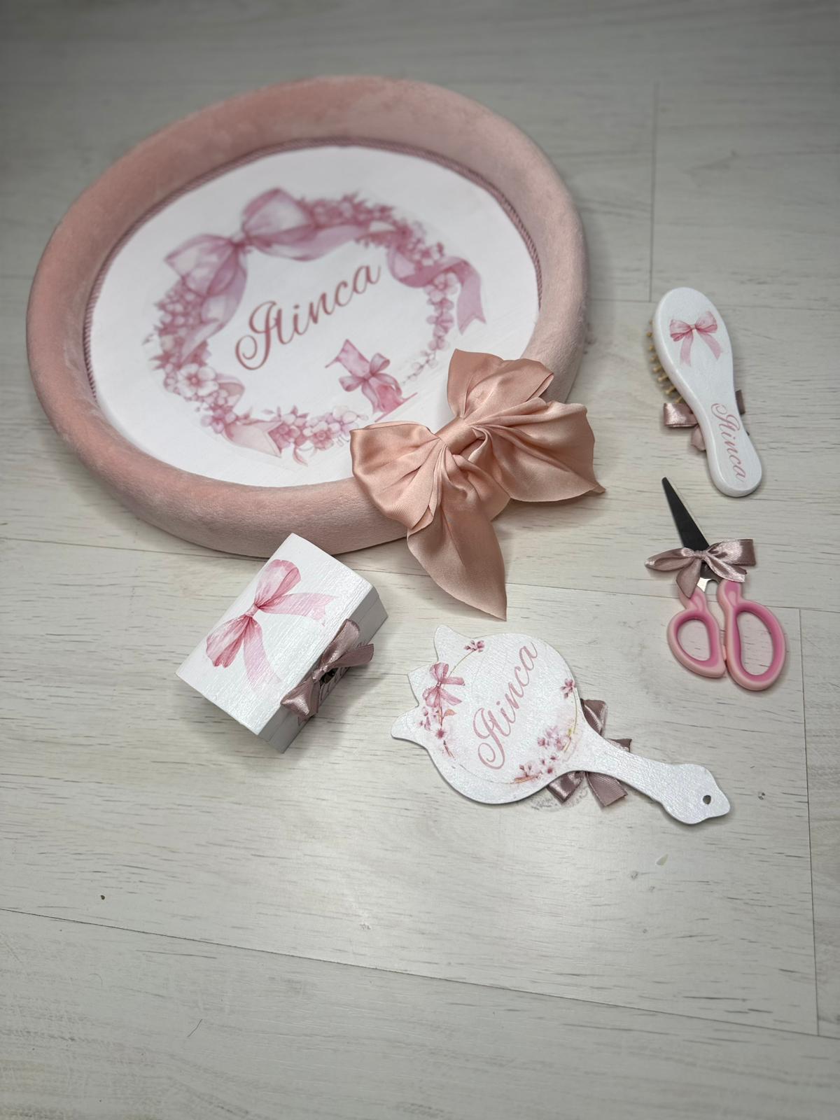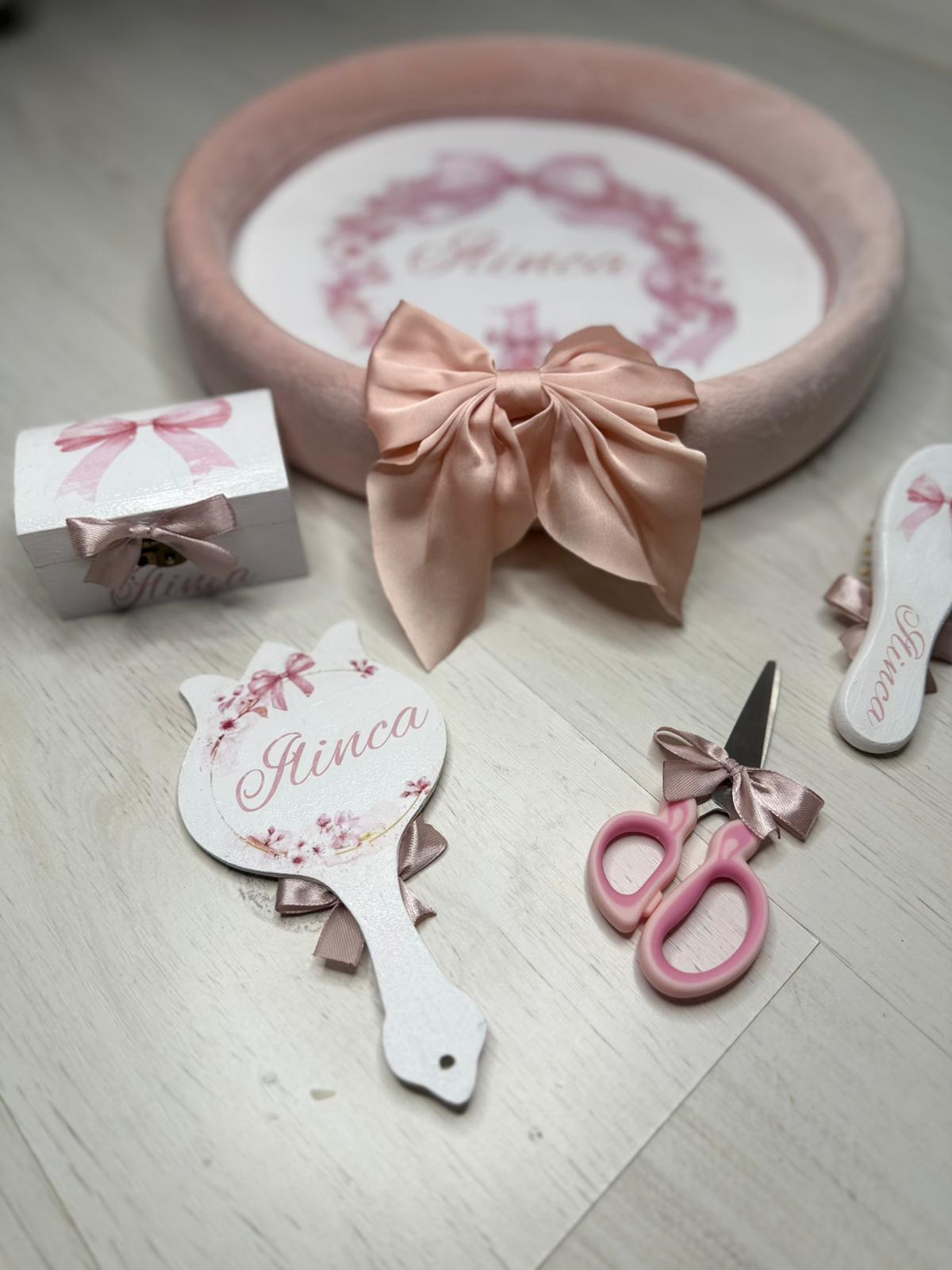 Setul conține: Tăviță din catifea cu diametru de 30 cm, perie , oglindă, foarfecă , cufăr pentru suvită si panglică pentru legarea suviței. Tăvița si accesoriile sunt realizate prin transfer de imagine .