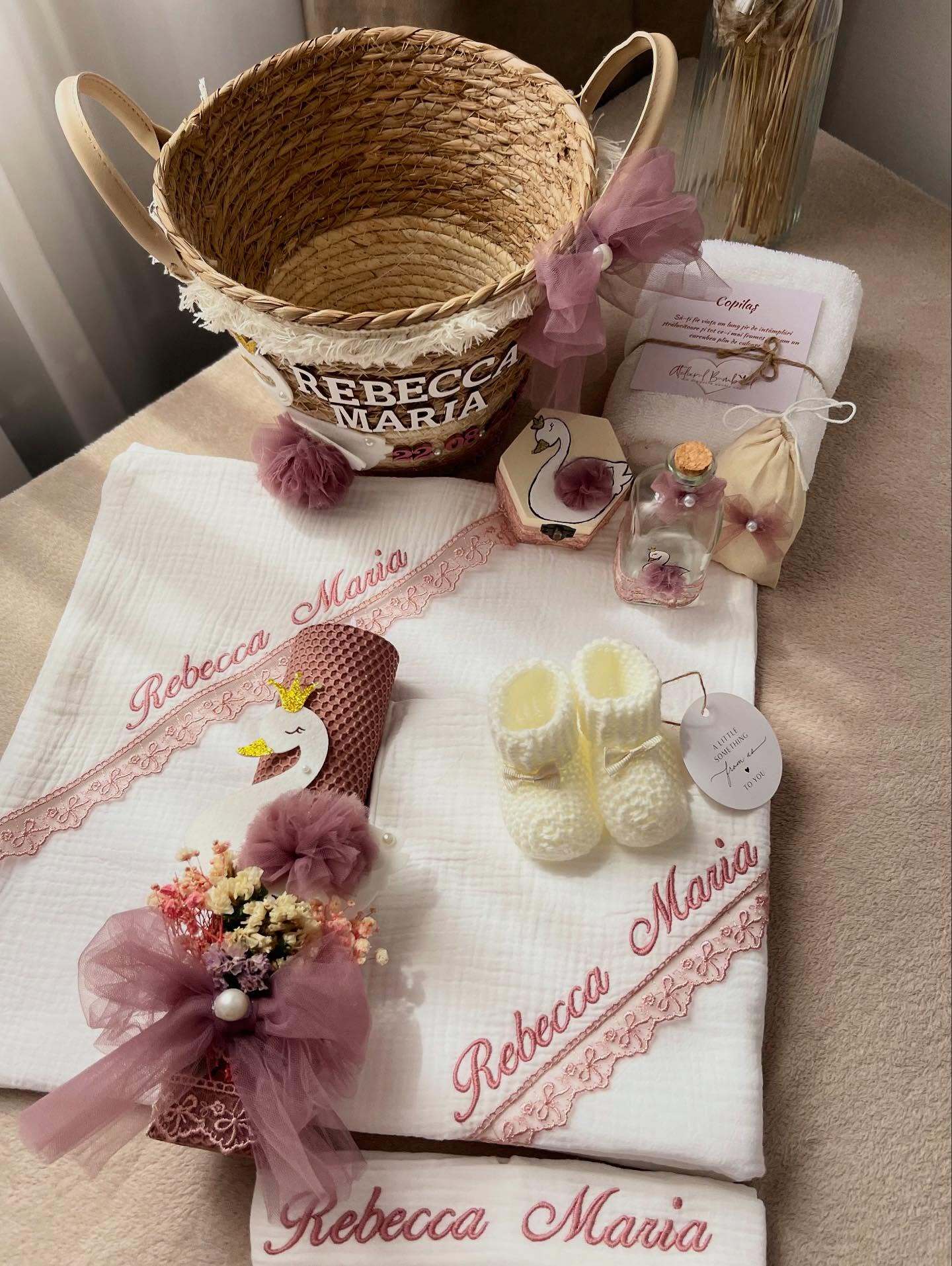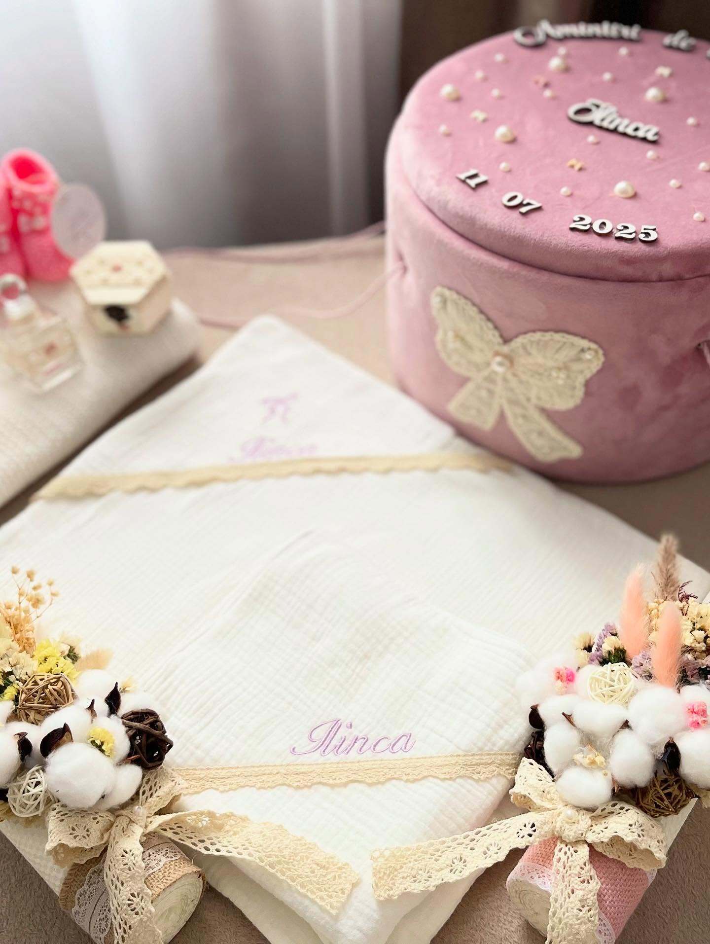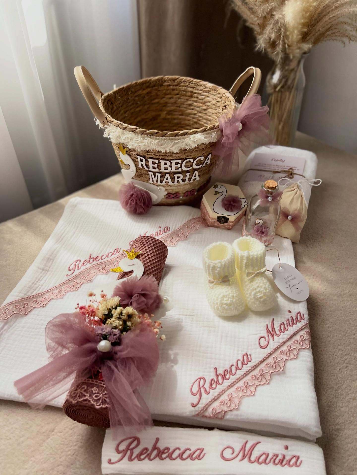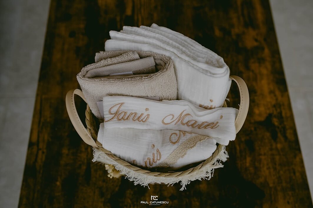 Personalizarea prin broderie de cea mai inalta calitate .Culoarea broderiei se face in ton cu panglica aleasa pentru model , se discuta ulterior la confirmarea comenzii .