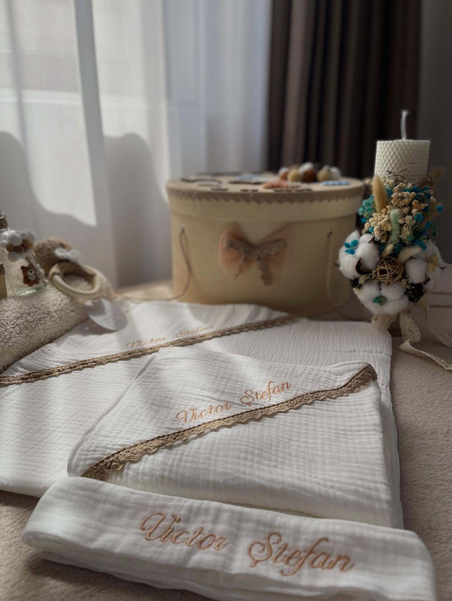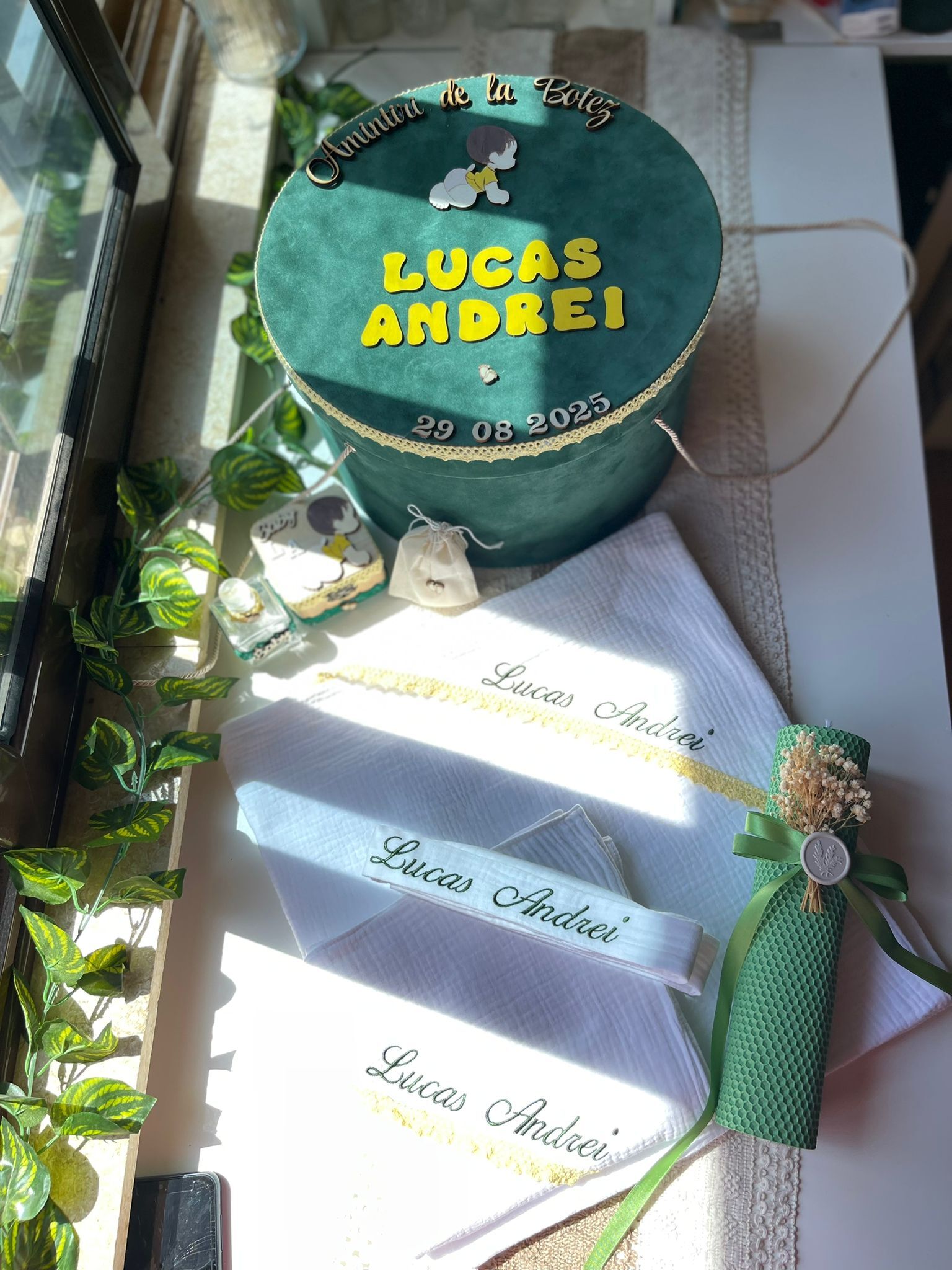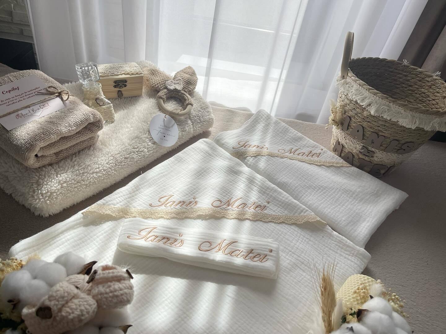 Personalizarea prin broderie de cea mai inalta calitate .Culoarea broderiei se face in ton cu panglica aleasa pentru model , se discuta ulterior la confirmarea comenzii .