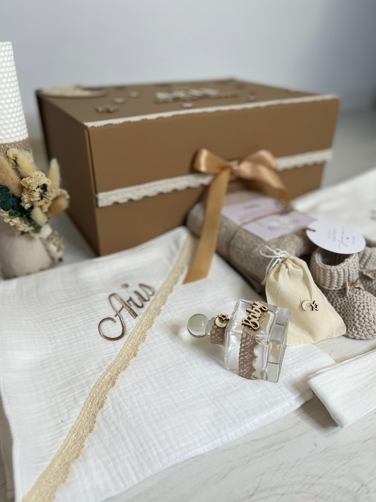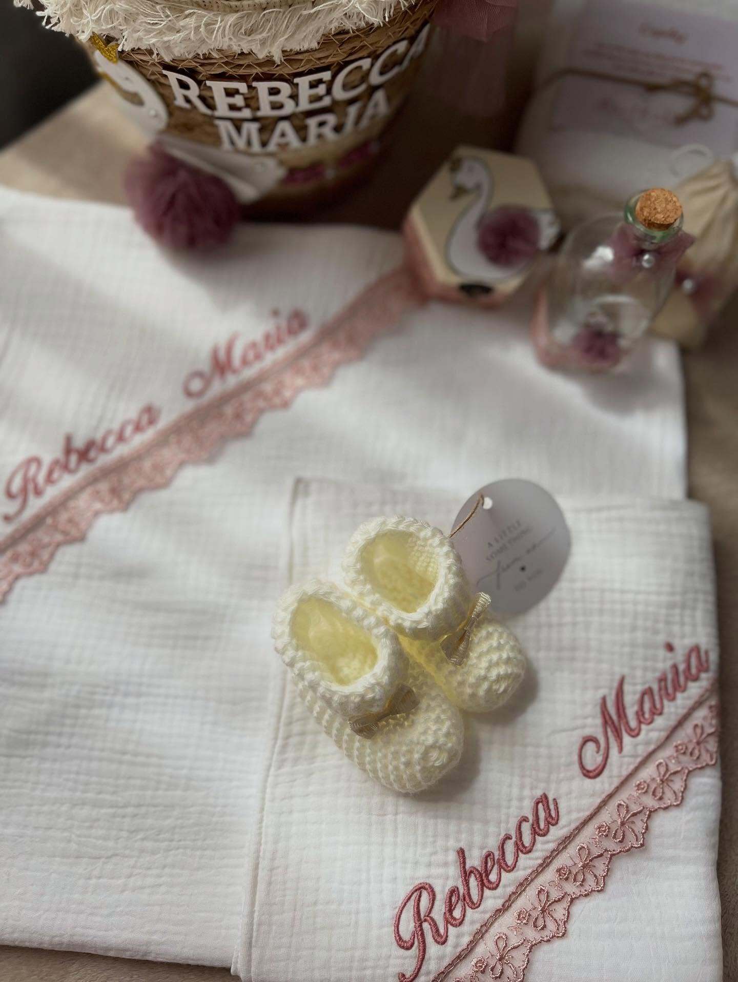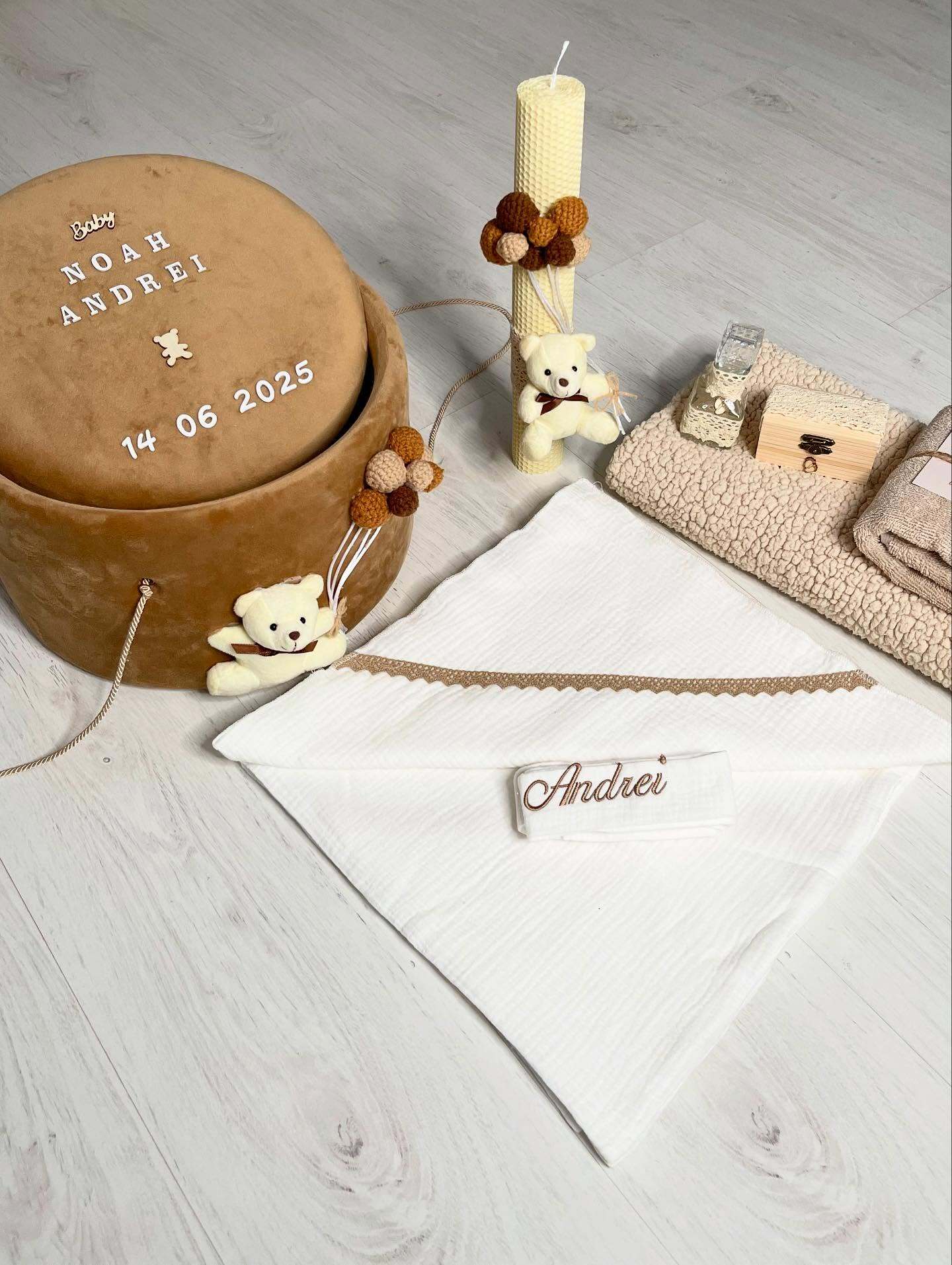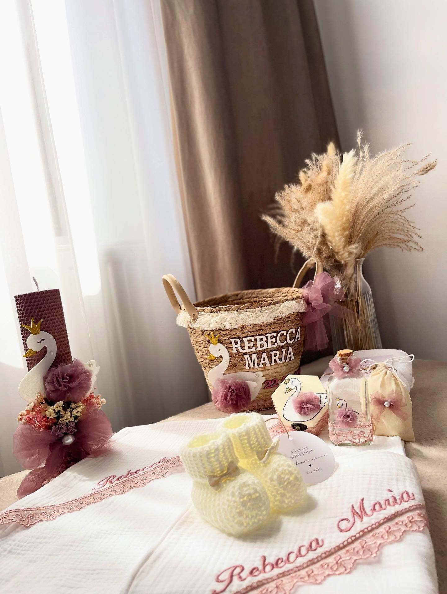 Personalizarea prin broderie de cea mai inalta calitate .Culoarea broderiei se face in ton cu panglica aleasa pentru model , se discuta ulterior la confirmarea comenzii .